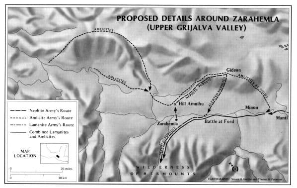 The Nephite war with the Amlicites is graphically illustrated on this map. The Amlicites journeyed southwest near the city of Amnihu and met the Nephites at the Hill Amnihu, across the river Sidon, where they were defeated (see Alma 2:15–18). They retreated past Gideon to the land of Minon and there regrouped and joined forces with the Lamanites, on the road to the land of Nephi, before marching toward Zarahemla (see Alma 2:20, 24). The Nephites, alerted of this attack, cut short their pursuit and returned to protect the city of Zarahemla (see Alma 2:25–26). They met the Amlicites and Lamanites at the ford of the river Sidon and again defeated them after a bloody battle (see Alma 2:27–34). The Nephites pursued the invaders out of the land into the wilderness of Hermounts (see Alma 2:35–38). The city of Zarahemla, the hub of Nephite government and commerce, is shown here against the topography of the Upper Grijalva Valley. The ancient ruins that correspond best with Zarahemla, called Santa Rosa, are now underwater and cannot be studied in depth; however, what we do know about Santa Rosa is enough to see similarities between it and the city of Zarahemla. Interestingly, Santa Rosa had a dual linguistic and social history, showing that two distinct groups of people most likely lived there. This corresponds with the people of Nephi and the people of Zarahemla under the leadership of Mosiah. Although Santa Rosa cannot be confirmed as Zarahemla, it is an interesting possibility.