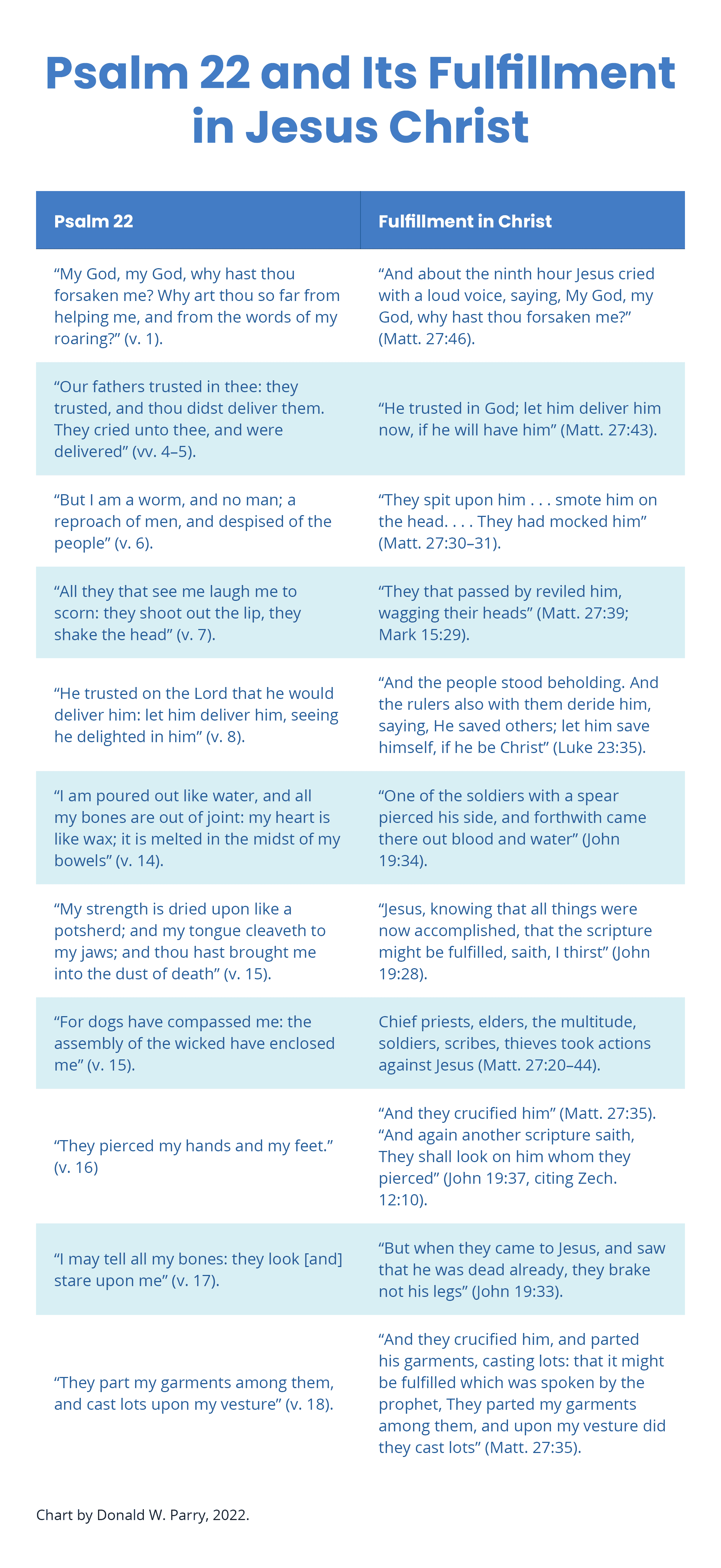 Psalm 22 is a remarkable prophecy regarding Jesus Christ’s final hours in mortality, when He suffered intense abuse followed by His Crucifixion. See the chart below. The psalm describes the people’s contempt of Jesus as they scorned and mocked Him and treated Him as if He were no greater than a worm. The psalm imparts the exact words Jesus spoke while on the cross: “My God, my God, why hast thou forsaken me?” (v. 1). Jesus spoke these words with “a loud voice” (Matt. 27:46) or, according to the psalm, with “roaring” words (Ps. 22:1), as if a mighty lion is speaking them. The psalm contains an explicit reference to the piercing of Jesus’s hands and feet (v. 16)—“They pierced my hands and my feet”—that was fulfilled when Jesus was crucified. The psalm’s words, “They part my garments among them, and cast lots upon my vesture” (v. 18), were precisely fulfilled by those who crucified Jesus. Matthew recorded, “And they crucified him, and parted his garments, casting lots: that it might be fulfilled which was spoken by the prophet, They parted my garments among them, and upon my vesture did they cast lots” (Matt. 27:35).