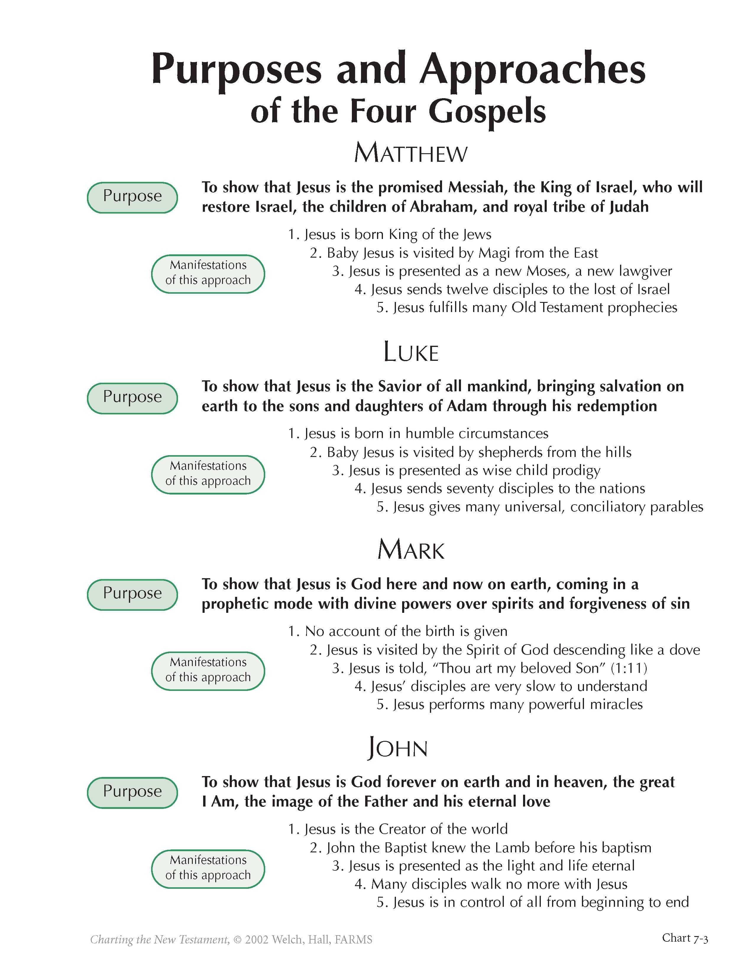 Because the testimonies of these four witnesses are extremely important in shaping our understanding of the Savior, detailed examination is often necessary. The results are enlightening and rewarding, even though challenges and difficulties often persist. Differences and even inconsistencies between the four Gospels beckon the best of minds to ponder and to reflect on their meaning. Can these differences be constructively understood and explained? As seen in chart 7-2, where one begins, in any literary work, often determines where the work will also end, for it fundamentally influences the author’s outlook, perspective, selection of episodes for inclusion, wording, and the resultant overall character of the work. With respect to the four Gospels, these consequences are demonstrated in chart 7-3, which illustrates how the overall purpose of each Gospel writer is manifested and carried out through several salient particulars in each Gospel.