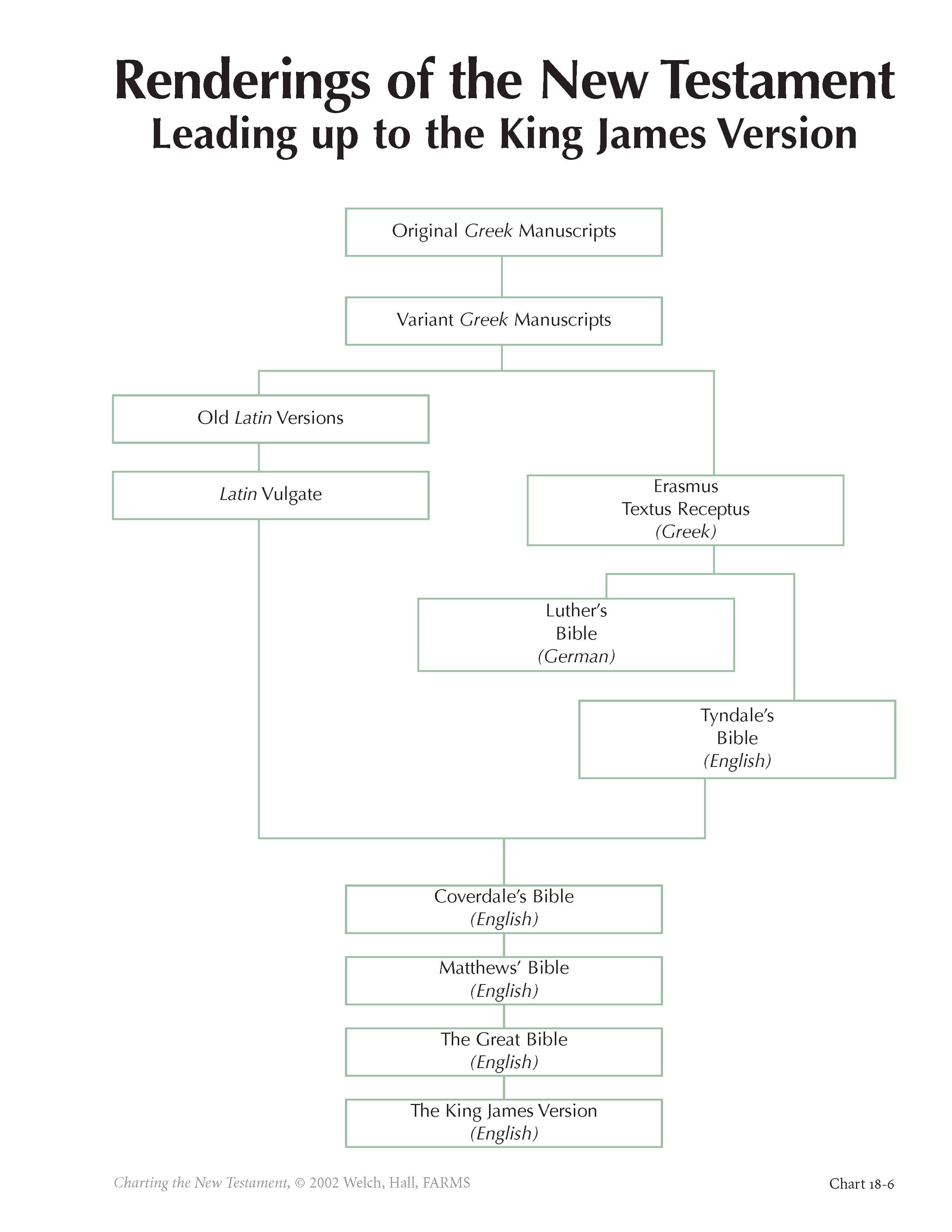 The schematic in chart 18-6 depicts this process, including the translation or “rendering” from the original Greek into Old Latin translations, which became the basis of Jerome’s Latin Vulgate translation. The latter remained the standard version of the New Testament in European countries for a millennium.