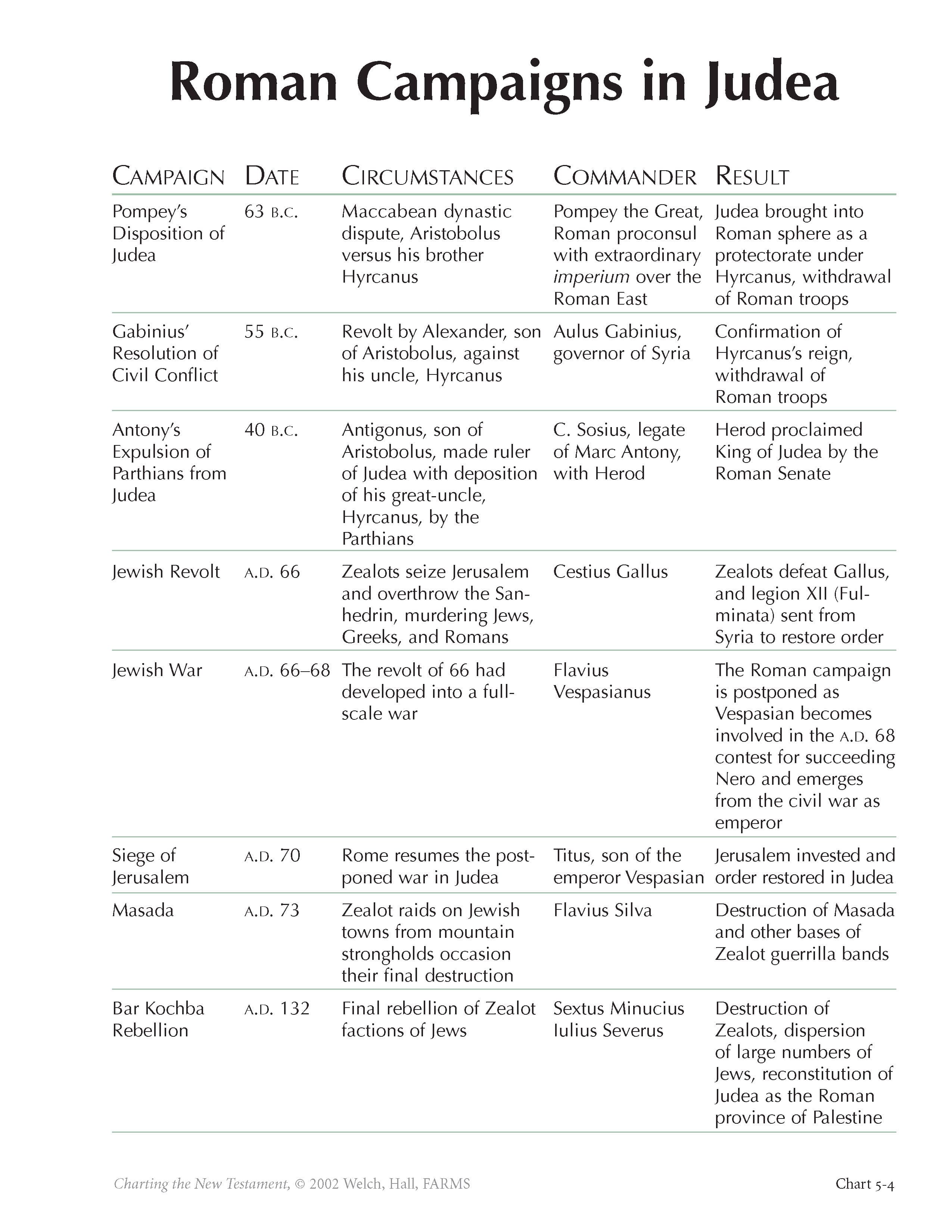 Chart 5-4 provides information about each of the campaigns Rome was forced to undertake in Judea, either to settle dynastic civil conflict or to repress Zealot insurrection.