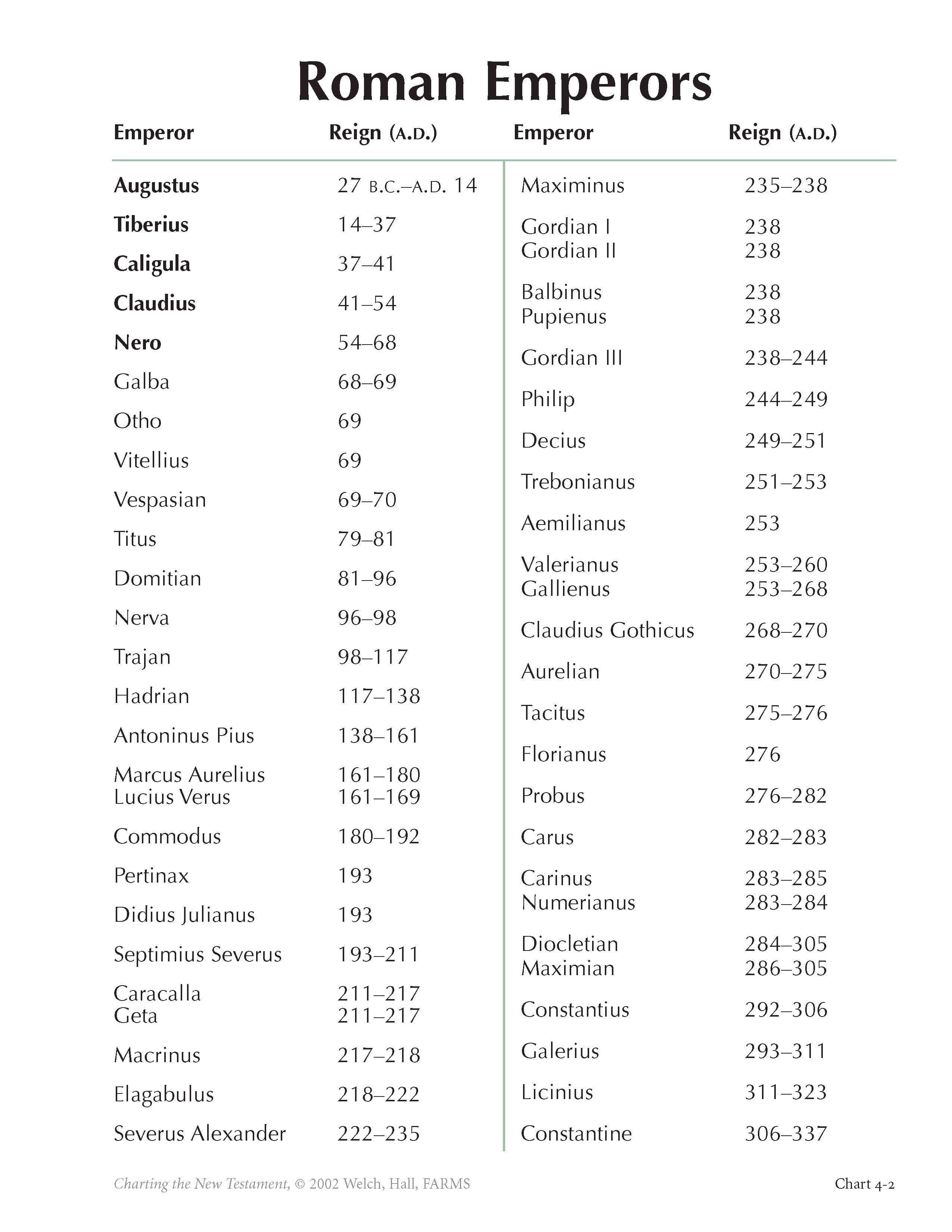 From the time of Augustus, Rome was ruled by emperors. The manner of their accession to imperial power varied. Some were selected by the Senate, others by the imperial guard, others as a result of revolution, many with the support of one or another faction of the military. Day-to-day governance was accomplished with the assistance of the Senate and an ever-increasing imperial bureaucracy. Usually individual emperors ruled, but on occasion two colleagues governed together, or, as under Diocletian, a college of four emperors. Some reigns were of long duration, others of only a few weeks, as in the calamitous year 69. The chart lists emperors and the dates of their reigns, from Augustus to Constantine, concurrent with the first three centuries of Christian history.