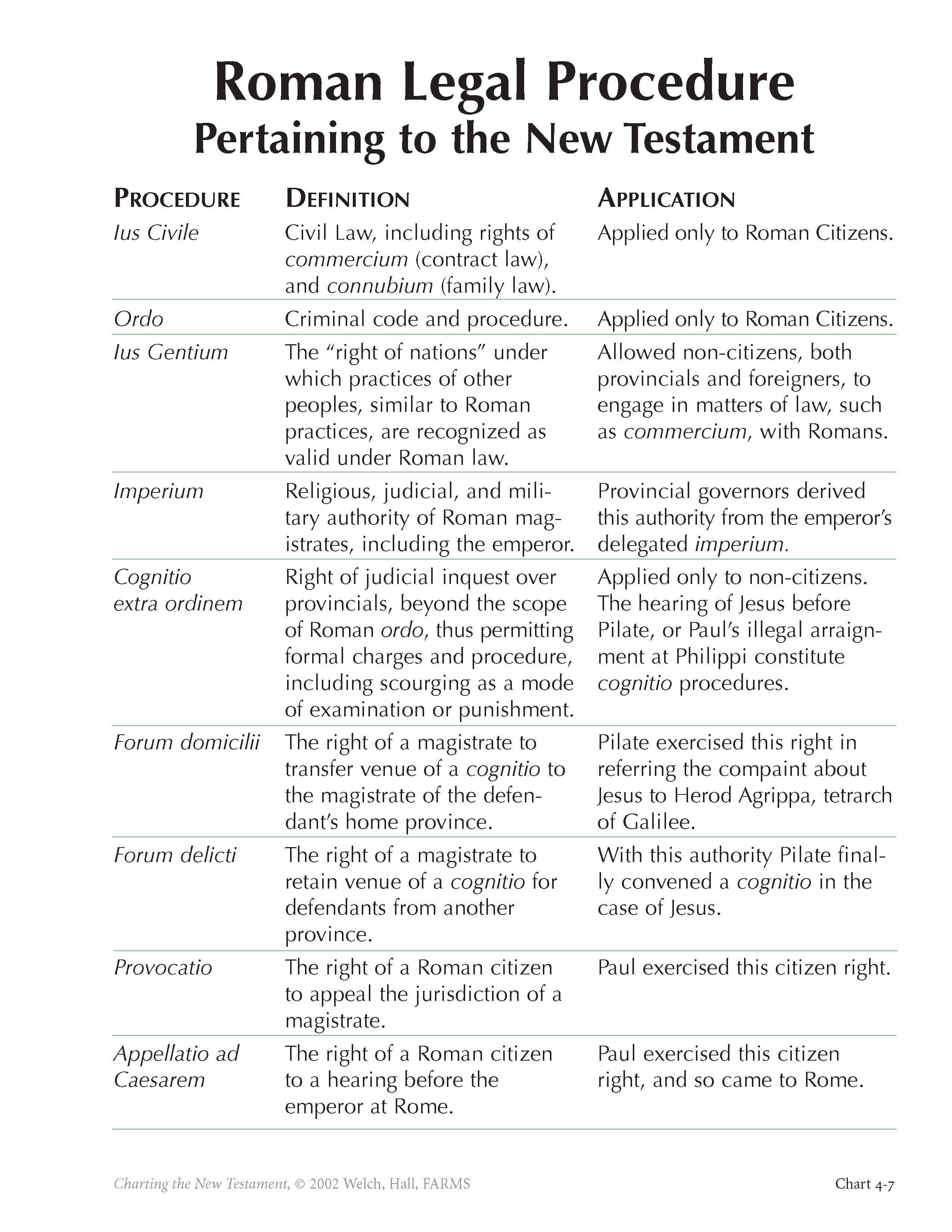 Roman law gave order to life in the world of the New Testament. Chart 4-7 lists some of the basic aspects of Roman law and suggests some of the ways they would have been pertinent to legal cases involving Jesus and Paul.