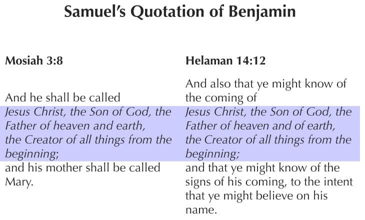 Though Samuel did not explicitly state that he was quoting Benjamin, his words in Helaman 14:12 are a precise repetition of Benjamin's key words in Mosiah 3:8. Samuel could have known of the teachings of Benjamin through the ministry of Helaman's sons Lehi and Nephi to the Lamanites. Because Helaman stressed that his sons should remember the words of Benjamin (see Helaman 5:9), it is likely that Lehi and Nephi used exact quotes of Benjamin in their proselytizing. In Mosiah 3:8, Benjamin revealed to his people, in connection with their covenant with God, the name and titles of their Lord God Omnipotent. This took place at Zarahemla. A century later, Samuel the Lamanite stood on the walls of that same city and called the people to repentance. His use of Benjamin's covenantal language probably struck them especially powerfully.