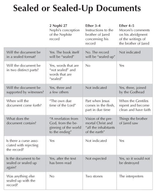 Nephi, the brother of Jared, and Moroni all commented on sealed or sealed-up portions of the Book of Mormon, the brother of Jared's vision, and Moroni's abridgment of the brother of Jared's writings. Sealed (hatom), as used in Jeremiah 32, has various meanings. Hatom means literally that a seal has been placed on a document, but it also implies that the document may be "unavailable" or "complete." Similarly, in their discussions of the sealed portion of the Book of Mormon, Book of Mormon prophets generally used the termsealed to express that a document was literally closed with a seal and sealed up to indicate that a document was unavailable. Knowing these definitions can help readers follow the accounts in 2 Nephi 27 and Ether 3–5.