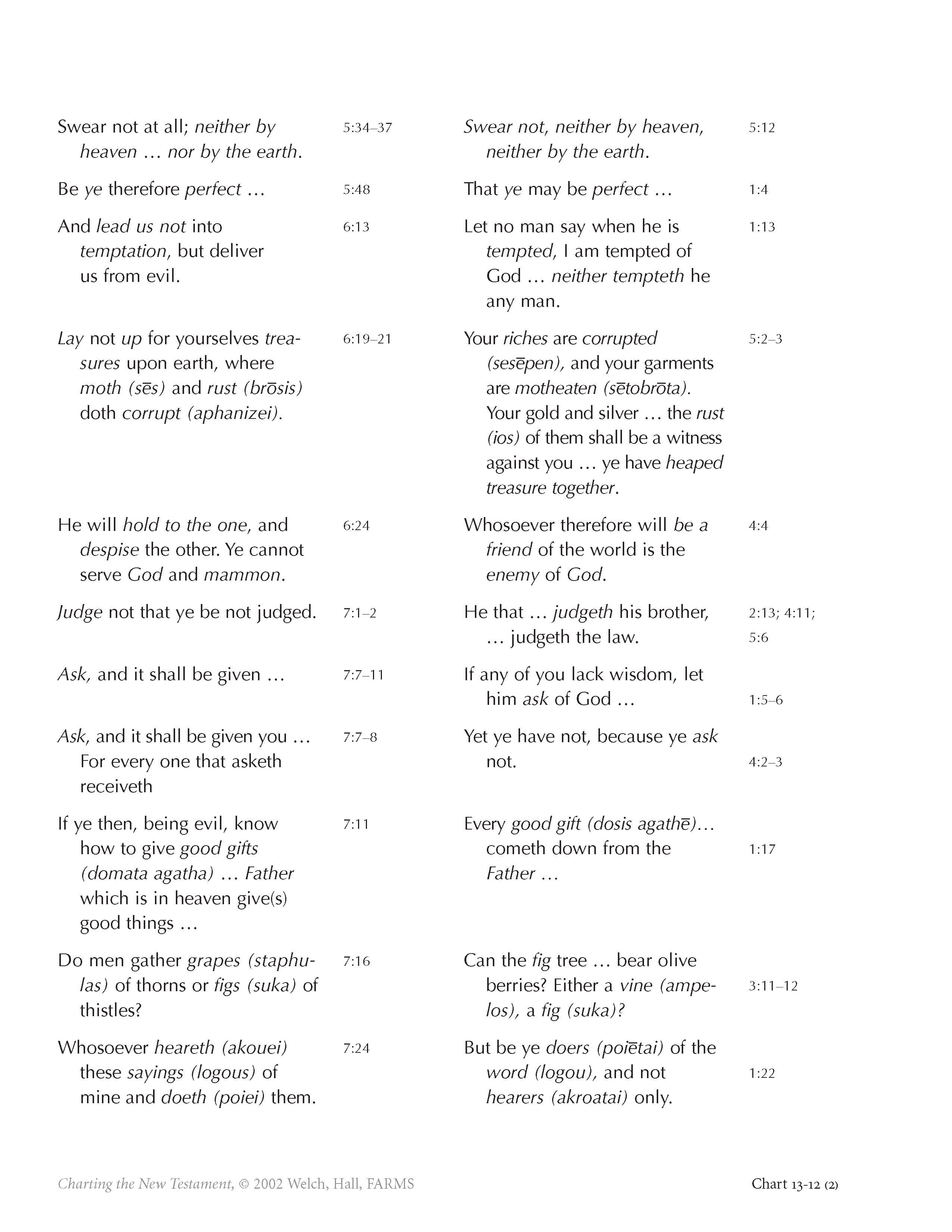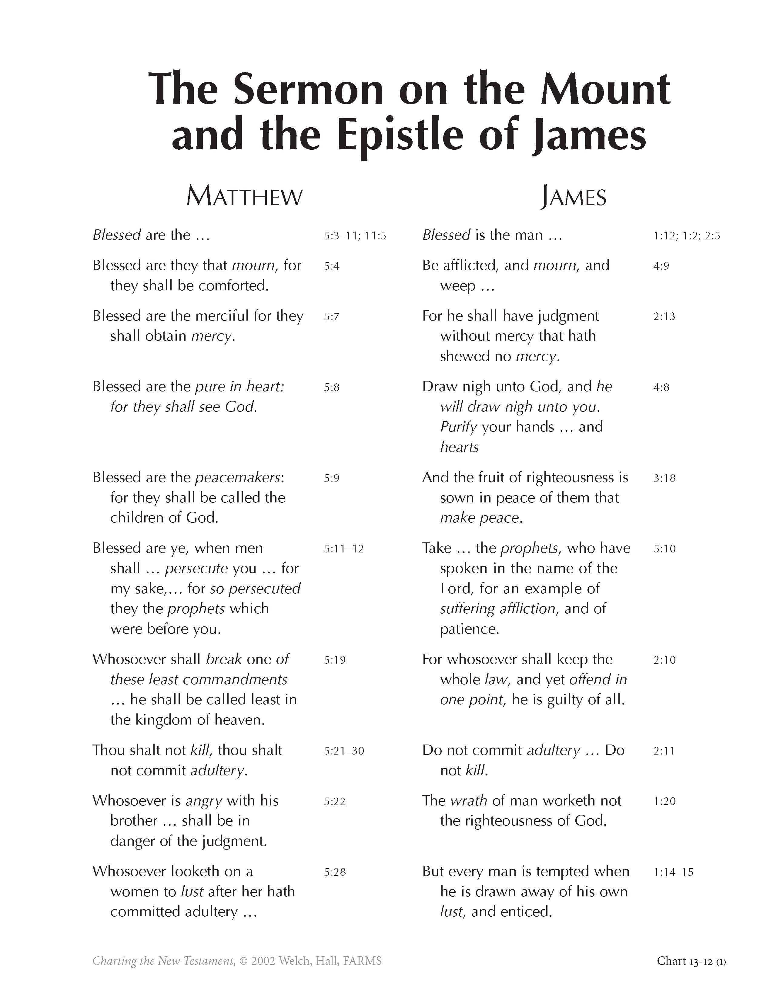 Rarely noticed by general readers, yet quite evident on closer inspection, are the parallels between the phraseology of the Sermon on the Mount in Matthew 5–7 and the vocabulary of the Epistle of James. Over twenty conspicuous similarities can be identified. Various explanations may account for this similarity. Above all, this consistency shows that James and his broad, early Christian audience knew and revered the words of their Lord and Master, especially the directives found in the Sermon on the Mount.