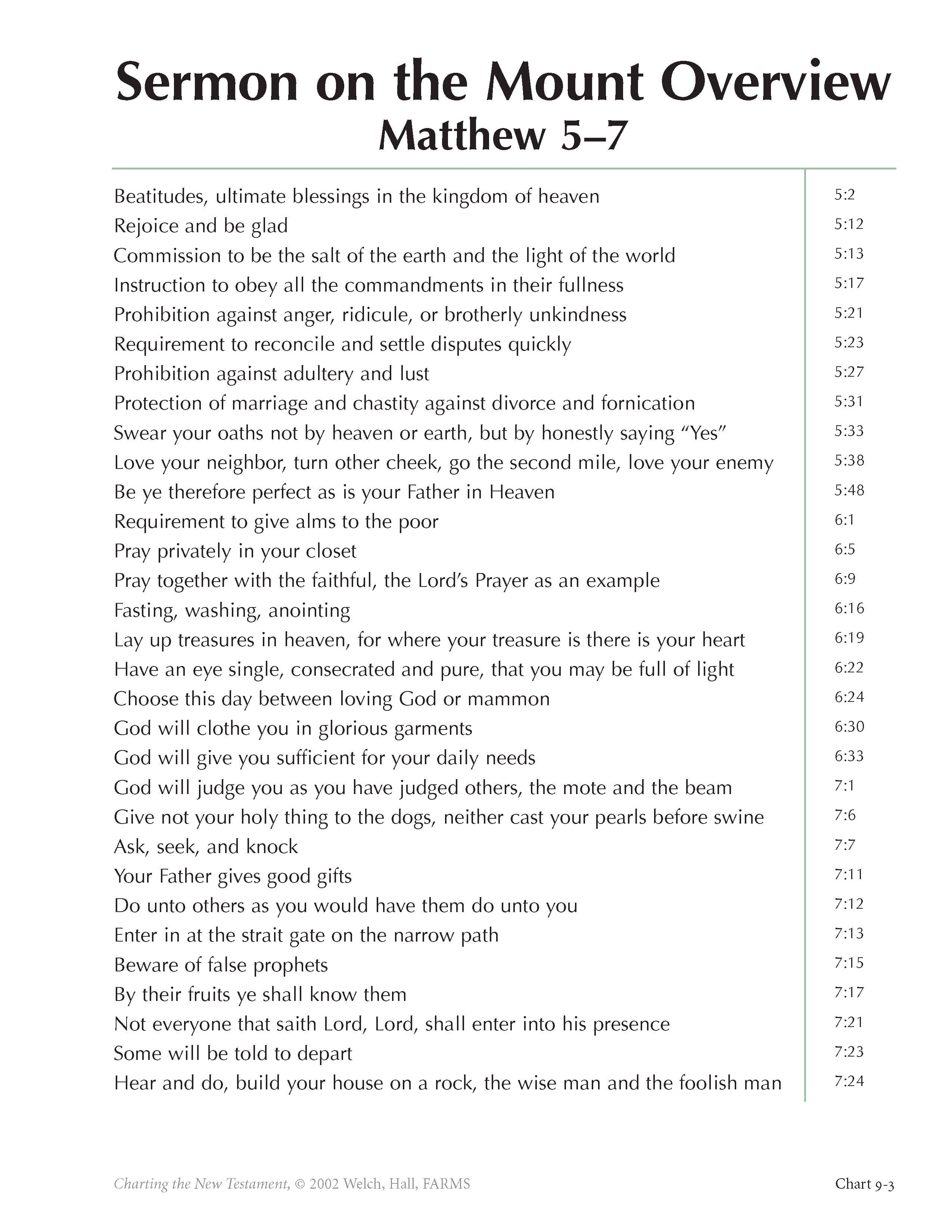 Chart 9-3 offers an overview of the Sermon on the Mount. Many people have wondered whether the Sermon is a single coherent text or whether it is, instead, a scrapbook of miscellaneous sayings without any particular structure or organizing principle. Recent scholarship, however, has begun to see the Sermon as a baptismal catechism or an instructional text teaching baptized Christians their advanced duties as members of the kingdom of God. While the Sermon on the Mount certainly contains many ethical and social teachings, it also goes far beyond the regular scope of an ordinary moral discourse.