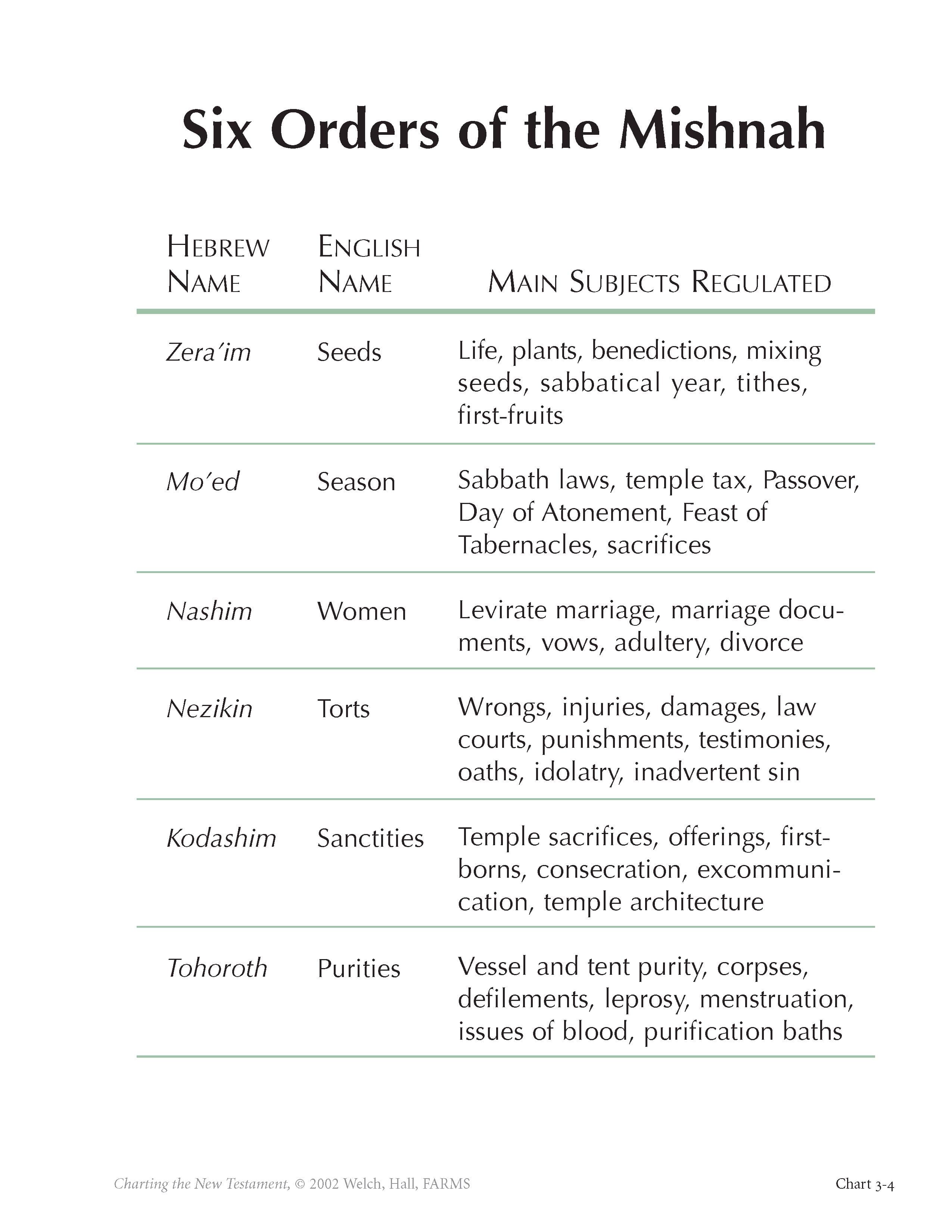Around the time of Jesus, the Mishnah began to take shape. This collection recorded the oral sayings of various Jewish rabbis. Chart 3-4 lists the “six orders” of the Mishnah and the main subjects that are discussed and regulated under each of these headings. Topics included such matters as tithing, Sabbath laws, the temple tax, adultery, divorce, oaths, leprosy, and purity. It is interesting to note that Jesus had something important to say about most of these main subjects.