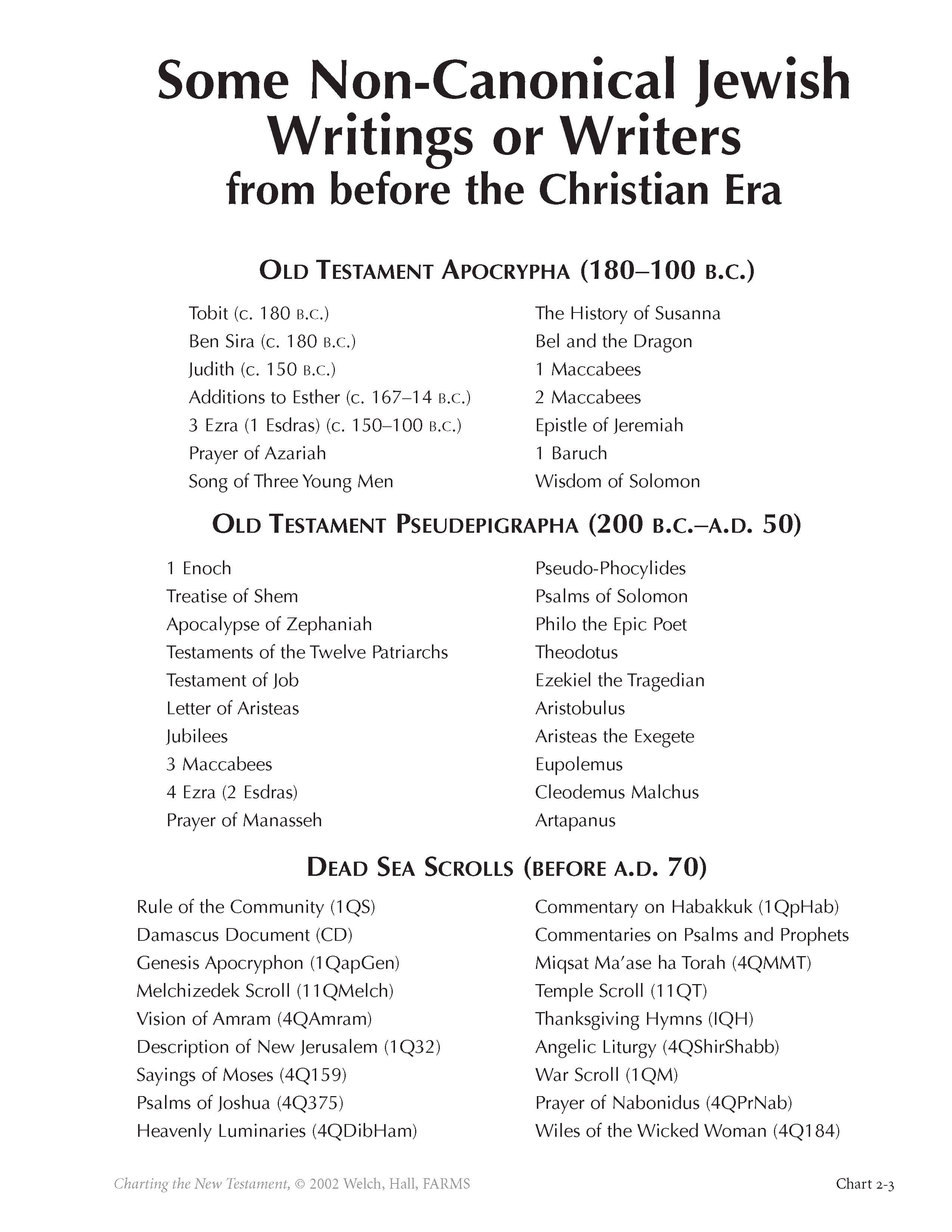 This chart lists the names and approximate dates of several of the Jewish books known to have existed in the first century B.C. or around the lifetime of Jesus. This was a highly literary world. Scrolls were written and read in Greek and Hebrew, covering a variety of topics and genres. Modern scholars have divided these works into three broad categories although in antiquity they usually existed only as separate scrolls.