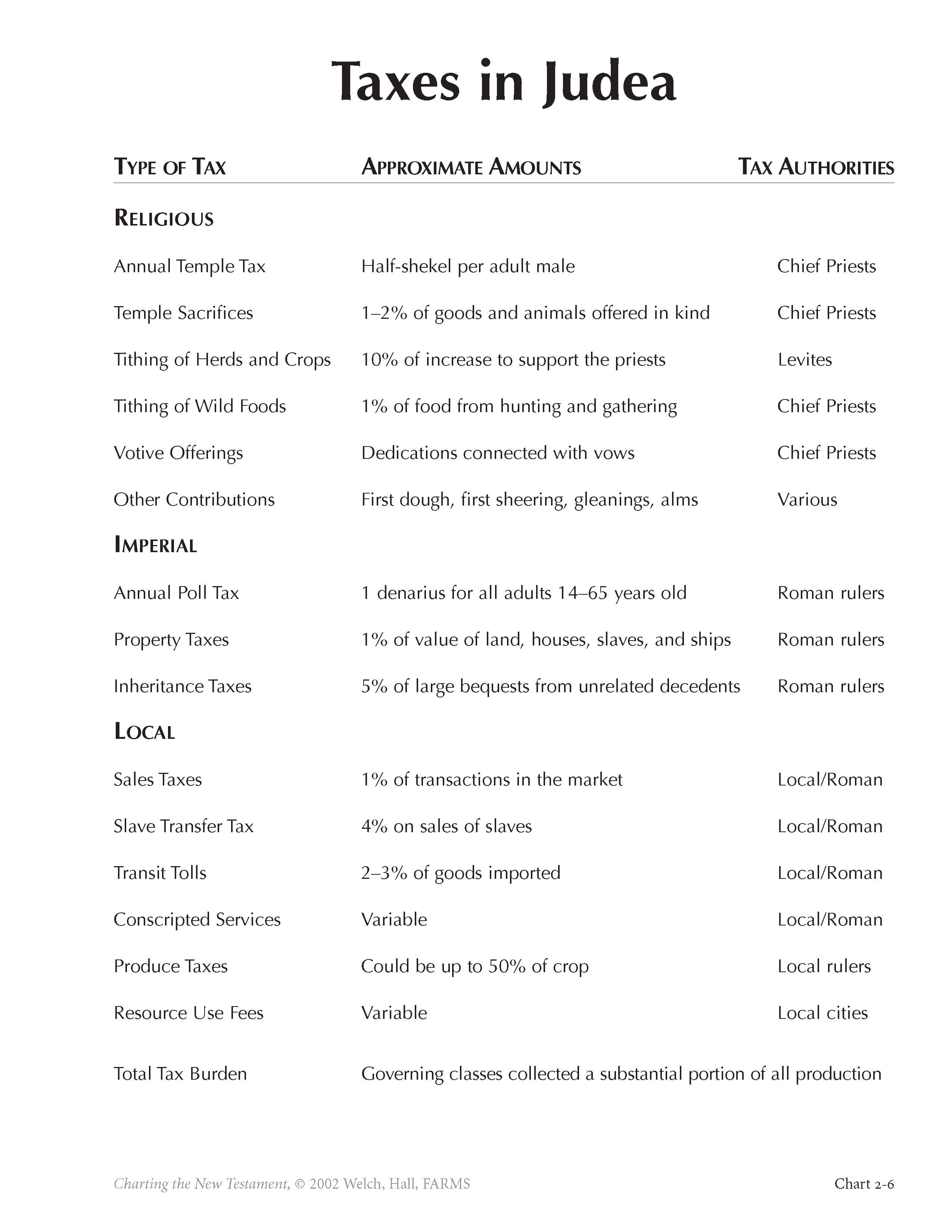 Taxation was as much a part of the world of the New Testament as it is in our world today. Various kinds of taxes were imposed, by differing authorities, and for an array of purposes. Religious taxes supported the temple and the central Jewish institutions. Imperial taxes went to support the Roman government, and local taxes were levied by Jewish rulers and paid for the infrastructure of Judean commerce. The total tax burden was perhaps as high as 60 percent of all production, but this burden was not primarily imposed by the Romans. As in any age, the combination of these many taxes resulted in popular dissatisfaction.