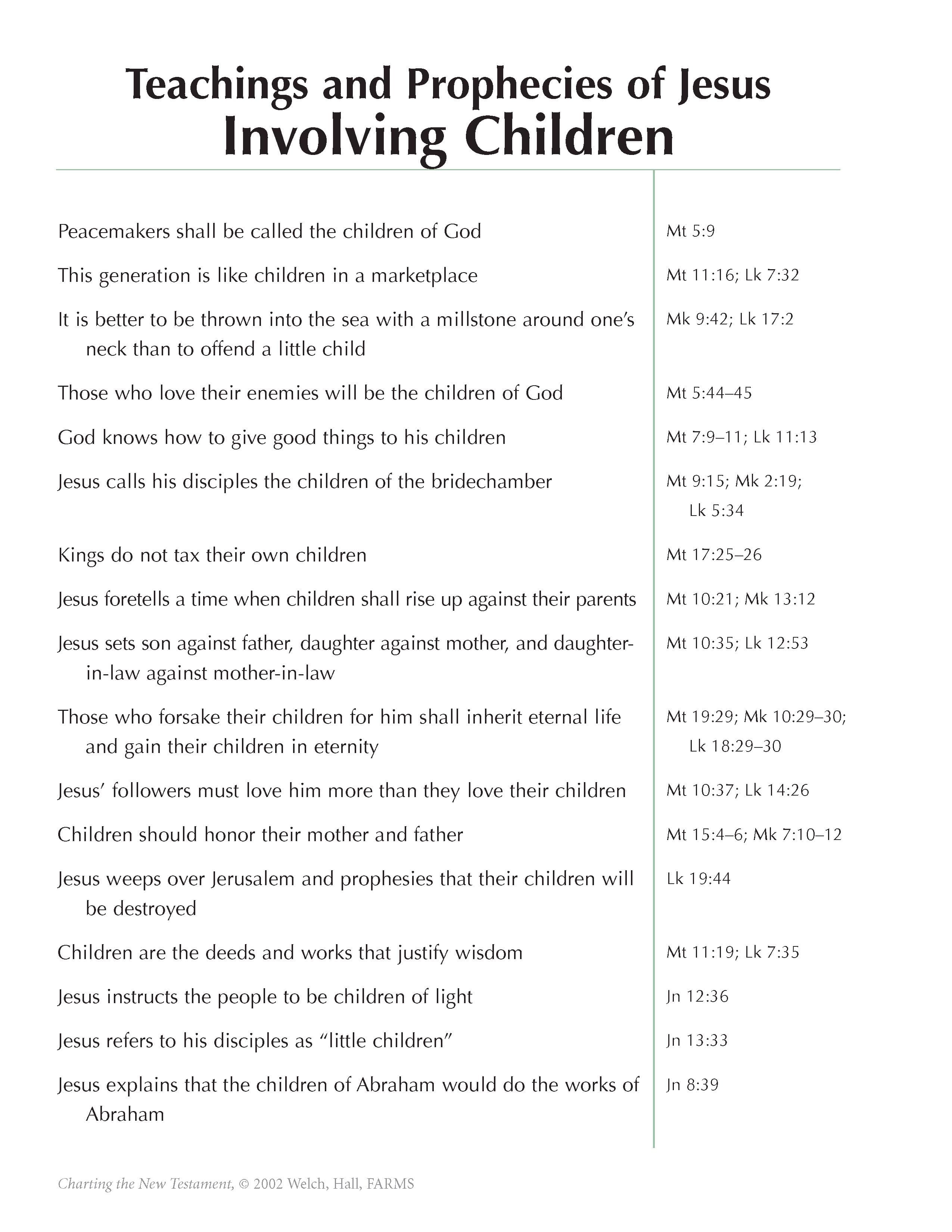 During his ministry Jesus interacted often with women and children, and in his teachings he often addressed them. Charts 9-12 and 9-13 show twenty-eight instances and many statements reflecting his concerns for women, widows, mothers, mothers-in-law, and friends who were dear to him. Charts 9-14 and 9-15 demonstrate eight episodes and many expressions of his love for and interest in the children of world who model humility and goodness. Modern readers should not overlook these unusually sensitive manifestations of the Savior’s love.