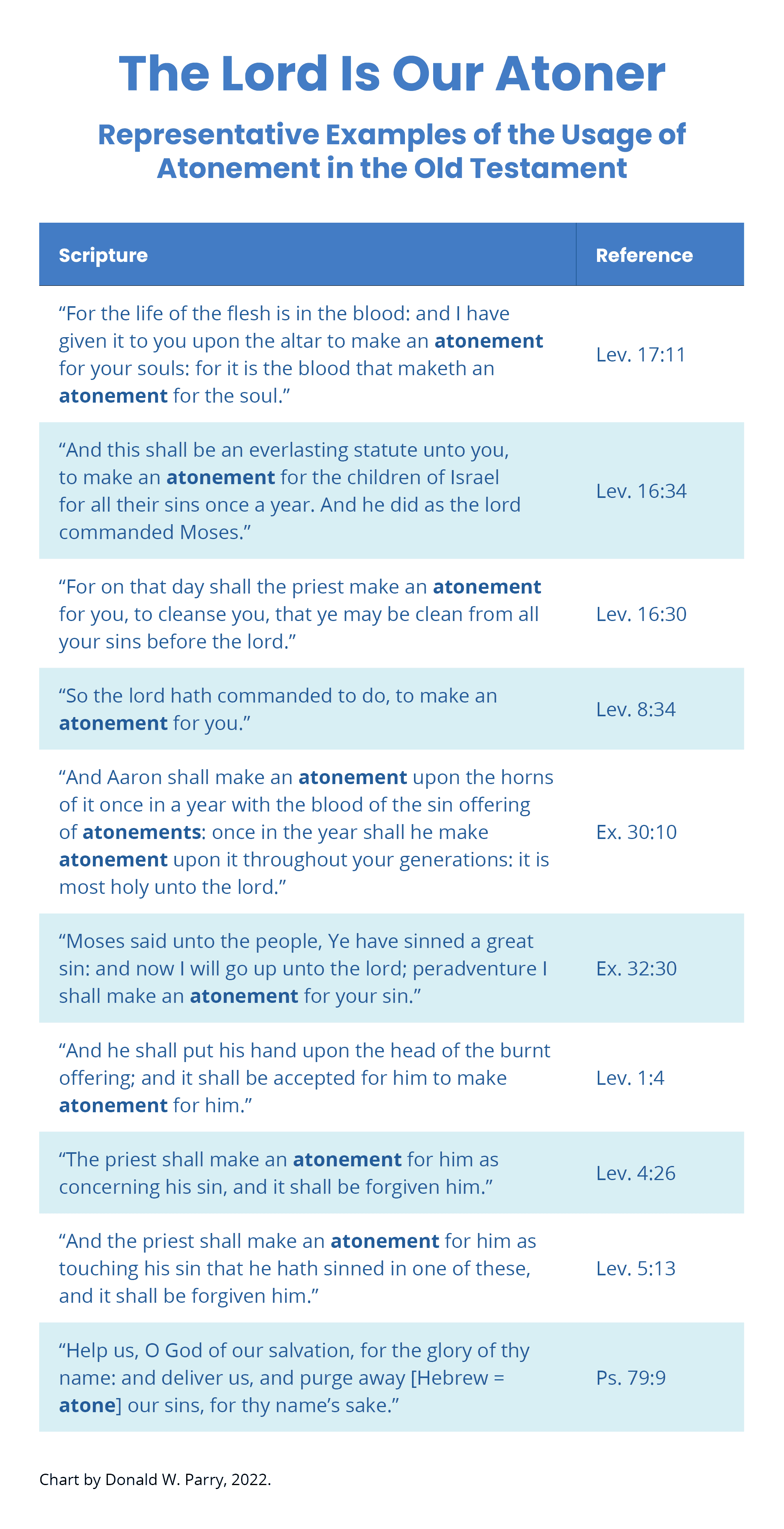 The Old Testament clearly reveals that Jehovah (= lord) is the Great Atoner. And Jehovah, of course, is none other than Jesus Christ. Over and over again, Jehovah commanded His prophets or priests to make an atonement for the people. Furthermore, the scriptures collocate the word atonement (or its cognate forms) with the words Lord, God, blood, forgiveness, clean, and sin(s) and with other words of theological import (see, for example, the passages in the chart). Psalm 79:9 summarizes, “Help us, O God of our salvation, for the glory of thy name: and deliver us, and purge away [Hebrew = atone] our sins, for thy name’s sake.”