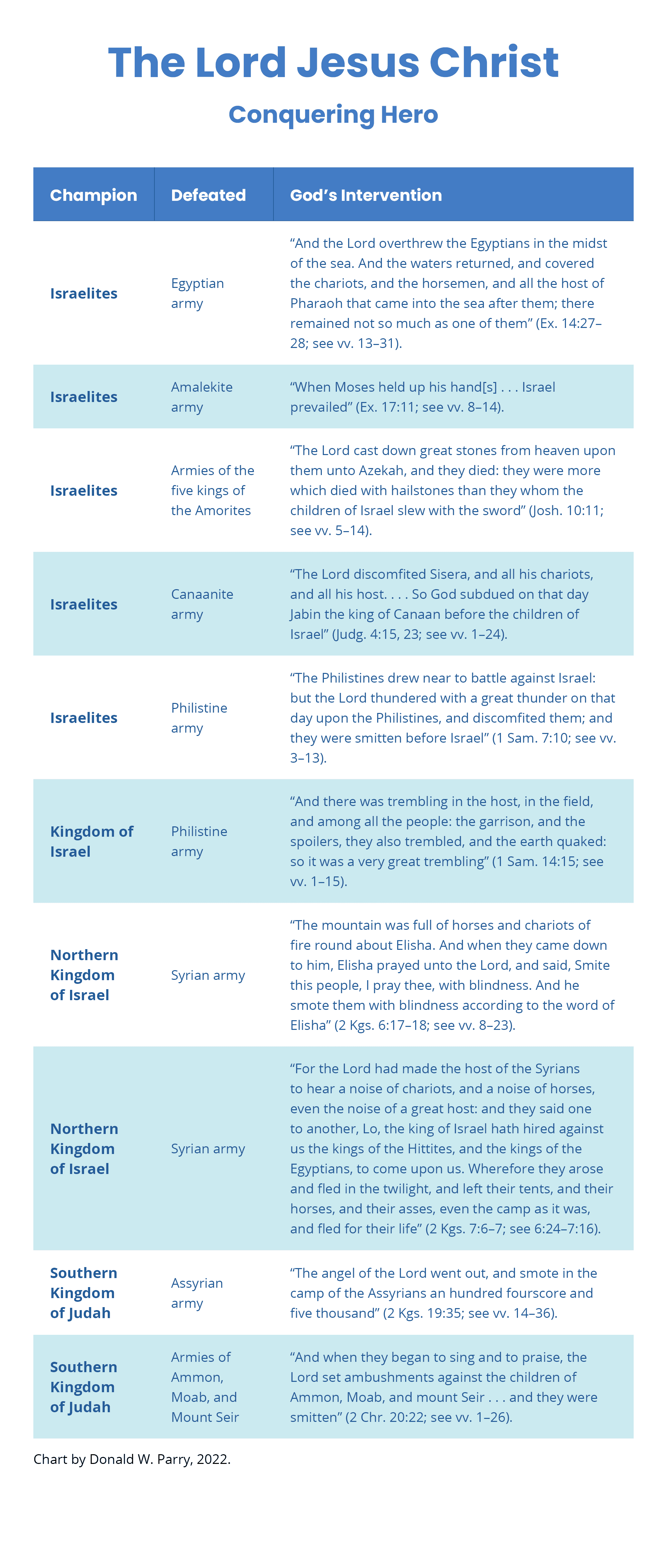 This chart sets forth examples of battles between Israel and the armies of foreign nations in which the Lord’s intervention won the battle for Israel. That Lord, of course, was none other than the premortal Jesus Christ.