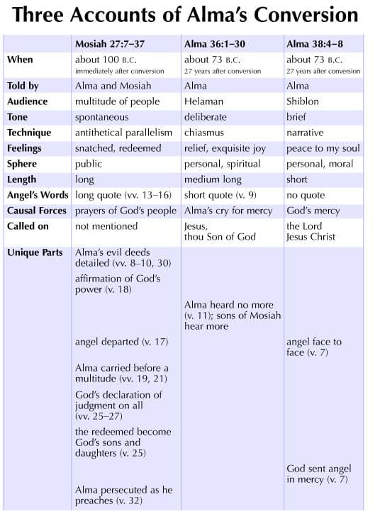 Alma's conversion is documented in three places in the Book of Mormon. This chart compares the rhetorical situation of each of these accounts and shows how the context of the situation may have in part determined the way Alma expressed his conversion story each time he told it. For example, Alma's initial account of his conversion (see Mosiah 27:7–37) is spontaneous and detailed, perhaps because it had just occurred and was still very vivid in his mind. In this account, he uses direct, antithetical parallelism to emphasize that the atonement had miraculously changed him from one former state into a new person. Alma's account to his son Helaman (see Alma 36) is the longest and most elaborate. This is perhaps because Alma gave this account in a blessing to his first son. To emphasize his pivotal acceptance of Jesus Christ as the Savior—the turning point in his life—Alma expresses his conversion story in the form of an extended chiasm. Alma's narrative account in Alma 38, given to his second son, Shiblon, is much shorter. Alma focuses on the mercy of Christ in this account and counsels Shiblon not to "boast" in his wisdom or strength. Though each account differs from the others, all were appropriate for the contexts in which they were given.
