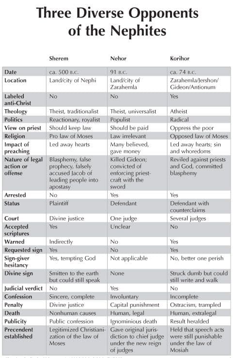 The trials of three major opponents of Nephite leadership—Sherem, Nehor, and Korihor—are documented in the Book of Mormon (see Jacob 7; Alma 1; 30). The situations and outcomes of those trials are compared in this chart. Although each of these men had his own style and persuasive tactics and each case is historically unique and distinctive, they were similar in their attempt to lead people down various "broad roads"—away from Christ and to spiritual death. according to its order in the scriptural passage it appears in.)