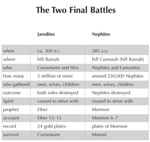 This chart compares the final battles of both the Jaredite and Nephite civilizations, which took place near the same hill (see Ether 15:11). Moroni, the only known Nephite survivor of the battle at Cumorah, was the narrator of the account in the book of Ether that involves the final Jaredite battle at Ramah. He must have been deeply impressed by the parallels between the two wars of annihilation. In both cases, nations of great promise were wiped away. Because of their wickedness, the Spirit of God "ceased to strive" with both peoples (Mormon 5:16; Ether 15:19). In this chart the dates, places, numbers of soldiers, outcomes, and other statistics of these battles are contrasted. Despite the consequent collapse of these civilizations, a remnant of Lehi's seed was preserved, fulfilling the promises made by the Lord to Lehi, Nephi, Enos, and other righteous Nephites.