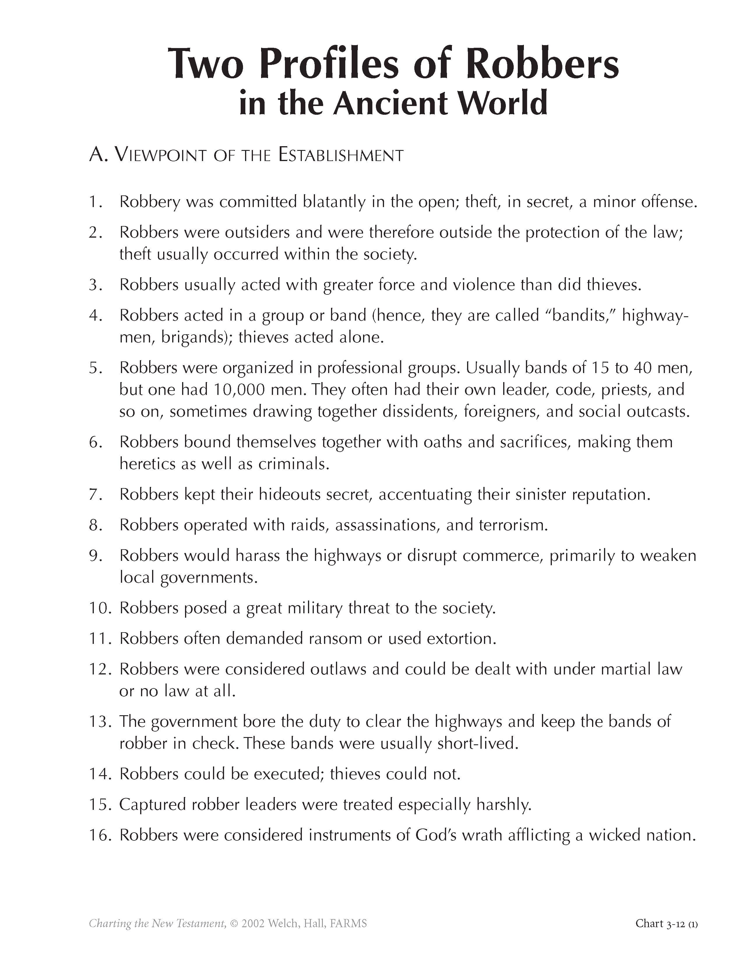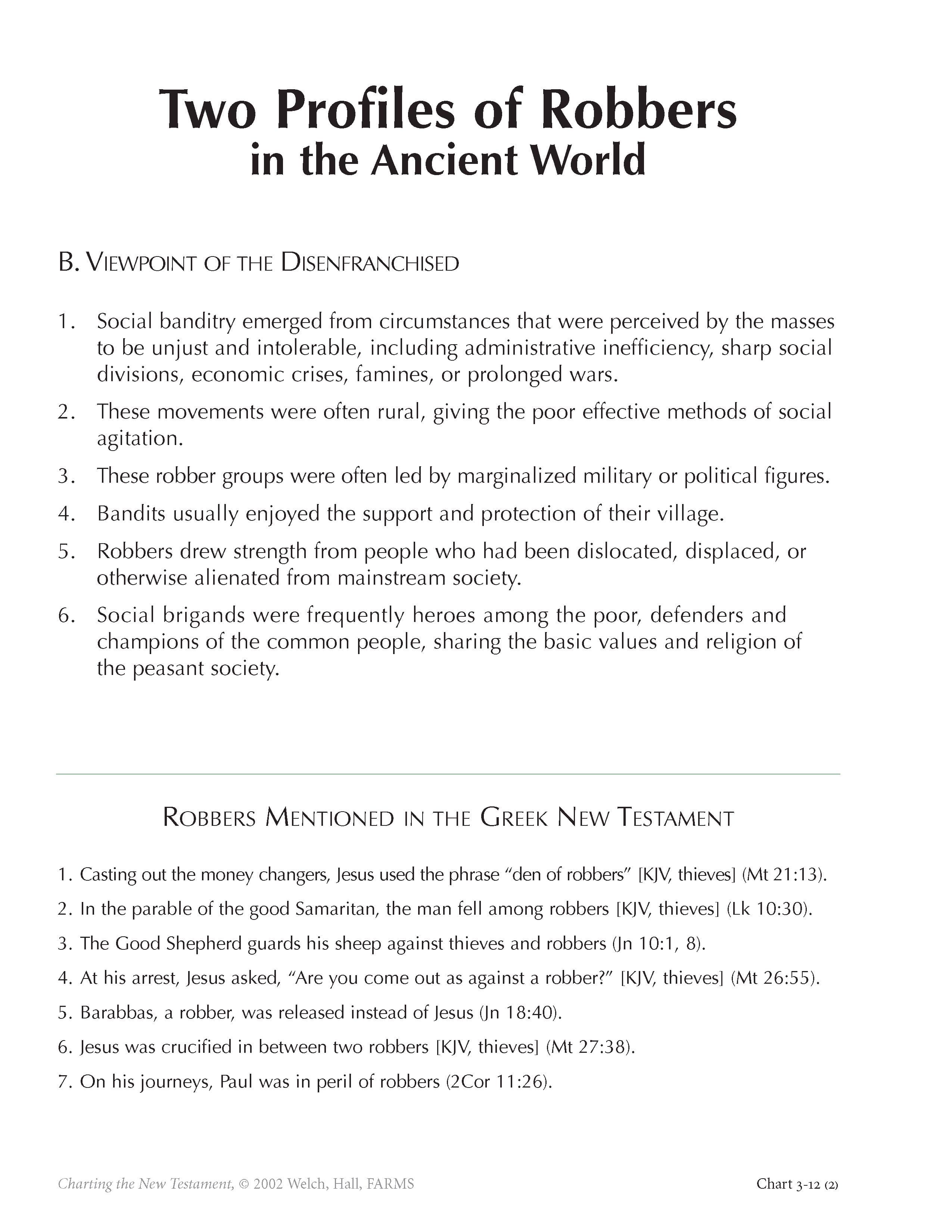 Chart 3-12 gives two profiles of brigands or robbers in the ancient world. Since “robbers” are mentioned seven times in the Greek New Testament (sometimes inaccurately translated as “thieves”), this subgroup on the fringes of the world of the New Testament needs to be understood carefully. From the viewpoint of the dominant government, robbers were vile outlaws; but from the viewpoint of the marginal elements of society, they were heroic Robin Hoods. An understanding of these two profiles explains how Jesus or Barabbas could have been seen as a robber, either favorably or unfavorably, depending on one’s social viewpoint. It also discloses important ways in which Jesus and his followers did not conform completely to either of these two profiles.