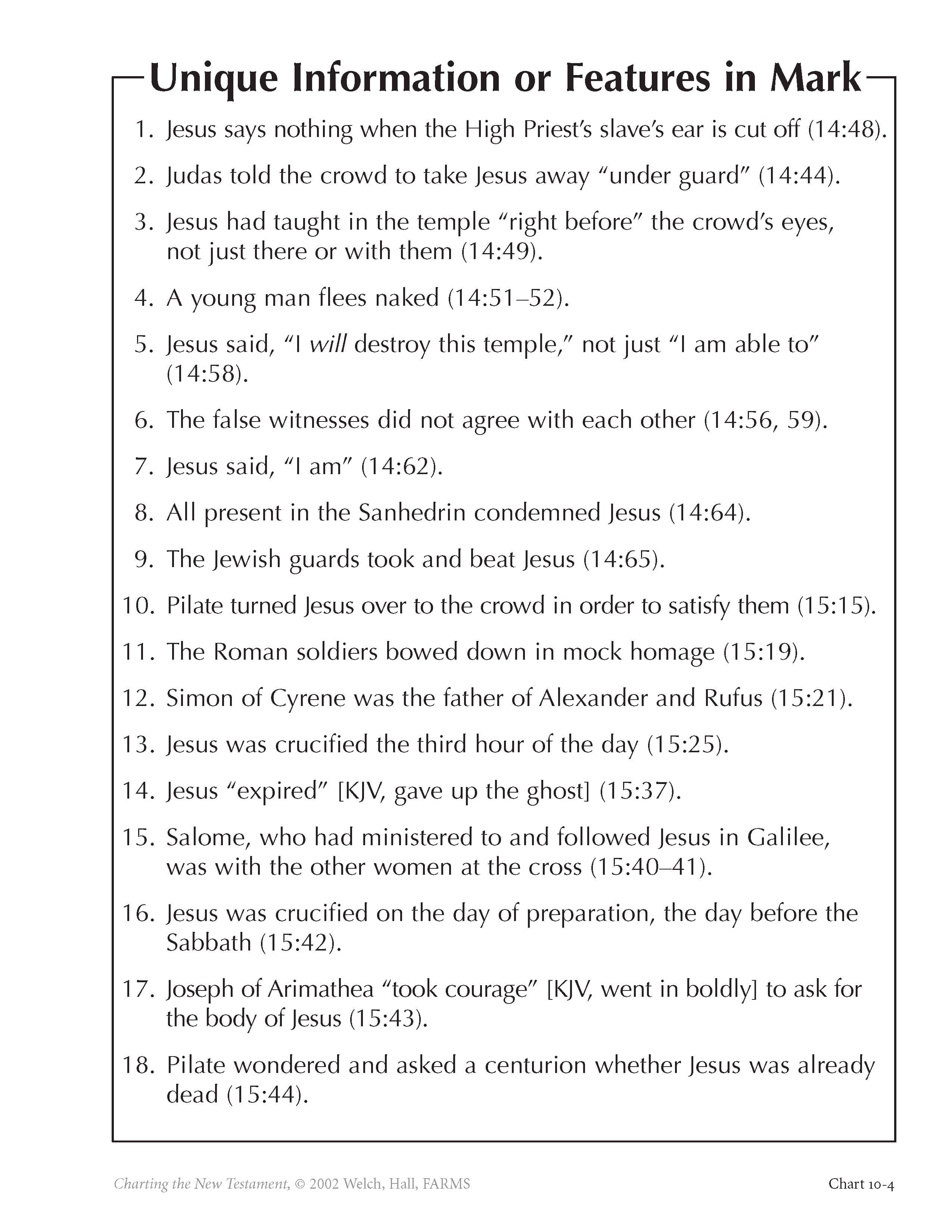 Each of the four Gospels provides unique information about the arrest, interrogations, trials, and execution of Jesus. The following charts spell out the data that is found exclusively in each of these accounts. Charts 10-3 through 10-6 are based on the Greek text of the New Testament, further details of which are conveniently displayed in tabular form in Kurt Aland, Synopsis of the Four Gospels, published by the German Bible Society. Careful readers of the New Testament will gain appreciation for each of the four Gospels by seeing how each one uniquely contributes to our understanding of the trial of Jesus. Chart 10-2 points out the details supplied exclusively by the Joseph Smith Translation.