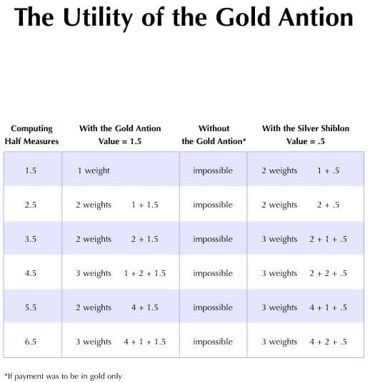 Under King Mosiah's monetary system, the gold antion was worth one and a half measures of silver or other commodities (see Alma 11:15, 19). It functioned as a useful commercial unit since it allowed more measures of grain or other items to be purchased with fewer units of precious metal, as this chart shows. Using as few monetary units as possible in the marketplace was most likely an advantage.