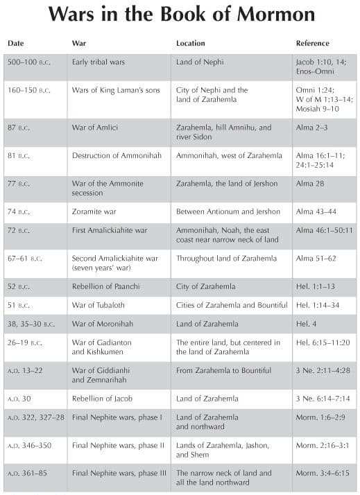 There are several major wars or periods of warfare documented in the Book of Mormon. The approximate dates and locations of these wars, along with accompanying scriptural references, are listed in this chart. Having names and dates for these wars can help readers keep all of this confusing action straight. Although the Book of Mormon is a complex record, it is still very clear and purposeful.