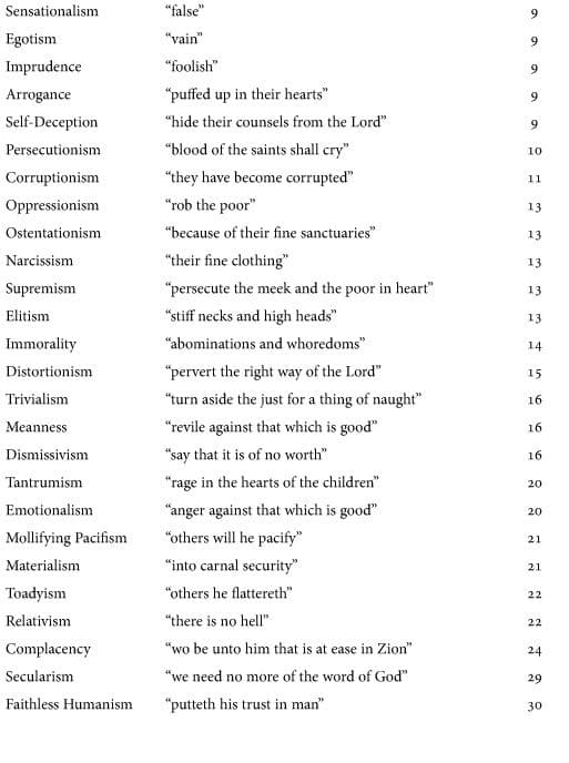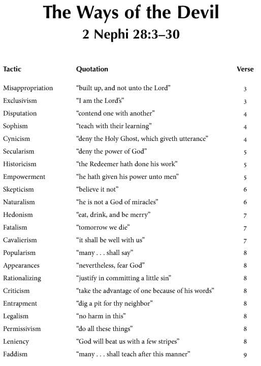 Embedded in Nephi's prophecy in 2 Nephi 28 are many phrases that describe the conduct of those who follow the devil. These sins, Nephi states, will pervade much of society in the latter days. Today they can be found well disguised as the philosophies and tendencies listed in this chart. Such conditions are symptomatic of society's passive acceptance of "false and vain and foolish doctrines" (2 Nephi 28:9) that can lead people away from God. Knowing how the devil works and being able to see his tactics in operation in the ideologies of the world around us help prevent us from being taken captive by Satan, who leads people "carefully down to hell" (2 Nephi 28:21).