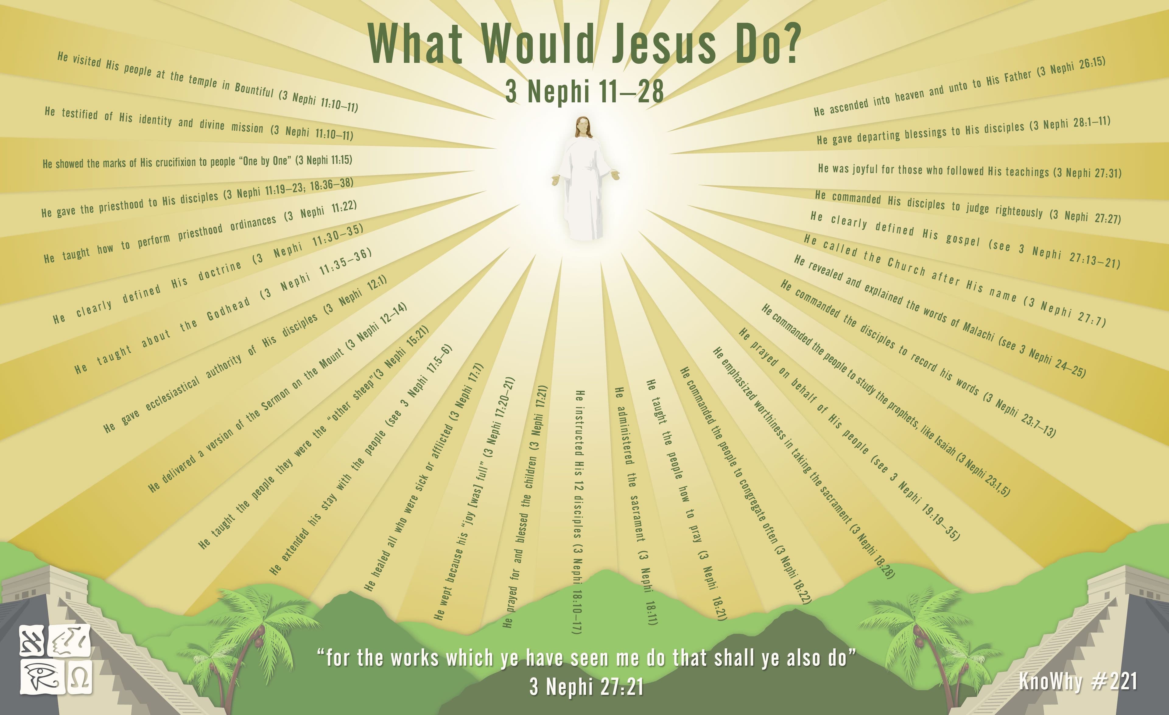 As part of His ministry among the people at Bountiful, Jesus declared, “ye know the things that ye must do in my church; for the works which ye have seen me do that shall ye also do.” This commandment suggests it is crucial for readers to do more than just understand the things Jesus taught; they must also pay careful attention to the things Jesus did. Recognizing what Jesus did can help explain why Latter-day Saints worship as they do. In all things, members of Christ’s church should seek to follow His example.