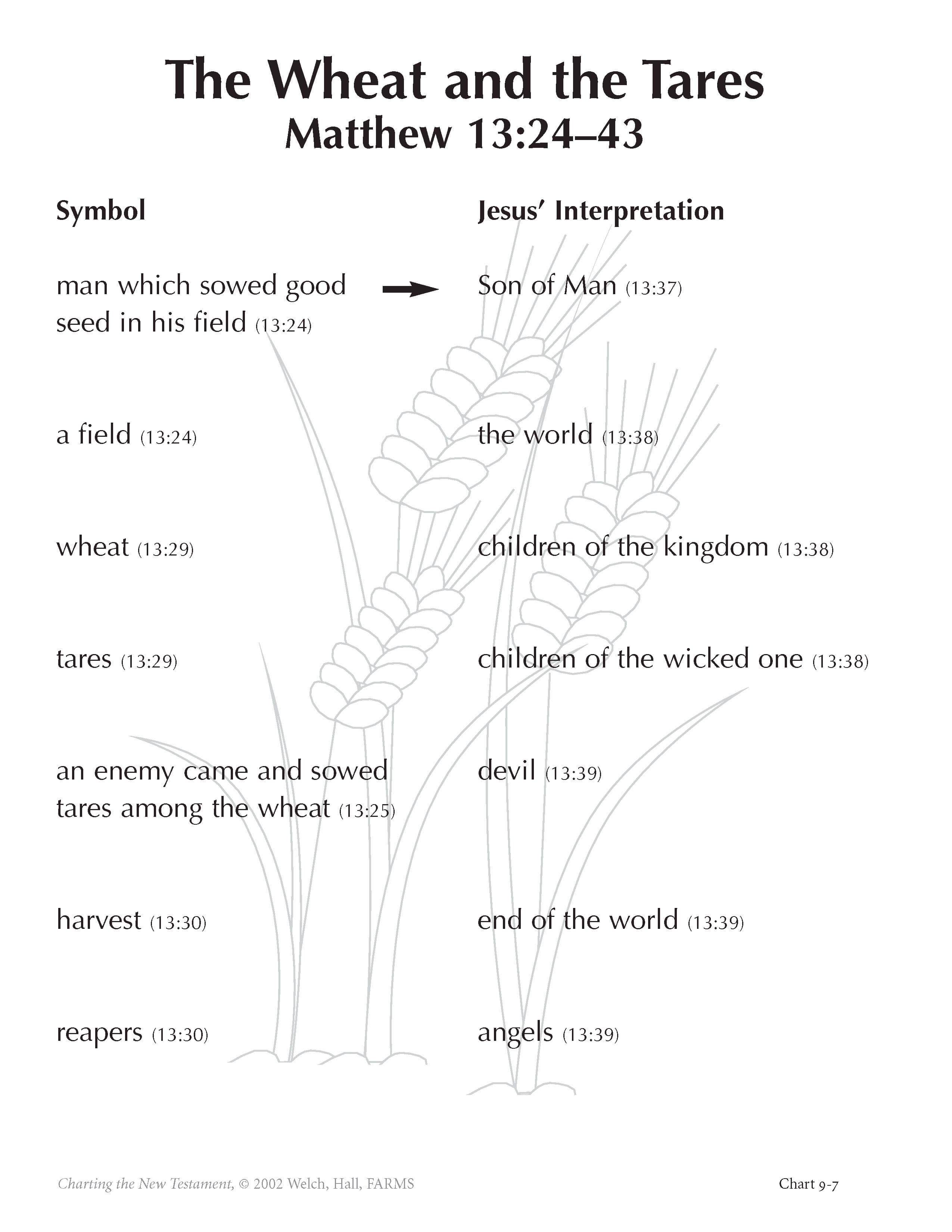 Jesus was a masterful teacher who often used parables to convey different levels of meaning to audiences with different levels of faith or understanding. See chart 7-7 for a full list of the parables. On two occasions reported in the Gospel of Matthew, Jesus took his disciples aside and told them the deeper meaning of his parables, for those who had eyes to see and ears to hear. Chart 9-6 illustrates the explanation he gave of the parable of the sower, and chart 9-7 shows the meaning of the parable of the wheat and the tares, both found in Matthew 13. The Prophet Joseph Smith affirmed that Jesus actually explained the symbolic meaning behind each of his parables: “The parables were all plainly elucidated” by Jesus to his disciples. Chart 9-8 displays the explanations given by Joseph Smith of the meanings behind the other parables in Matthew 13.