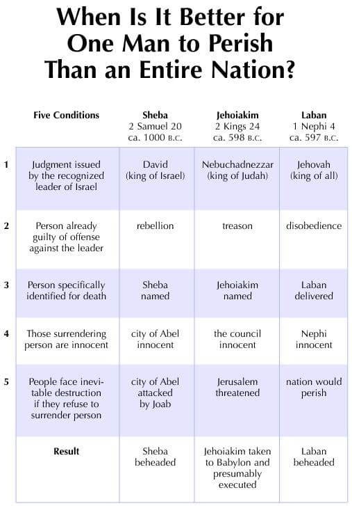 The Spirit told Nephi that the Lord had delivered Laban into Nephi's hands and that it was better for Laban to die than for an entire nation to perish because of unbelief (see 1 Nephi 4:11–13). Though this case is extremely rare, ancient Israelite law authorized the slaying of a particular man at least two other times. This chart compares Nephi's situation with two similar incidents found in the Bible: the beheading of the rebel Sheba and the execution of King Jehoiakim. Five conditions were present in each of these instances: The (1) recognized leader of Israel pronounced judgment upon a (2) specifically named person (3) guilty of some form of rebellion or disobedience that (4) would result in the destruction of at least part of Israel (5) unless the innocent people turned the traitor over for execution. Under these special circumstances, the law sanctioned the death of one instead of requiring innocent people to perish or be destroyed.