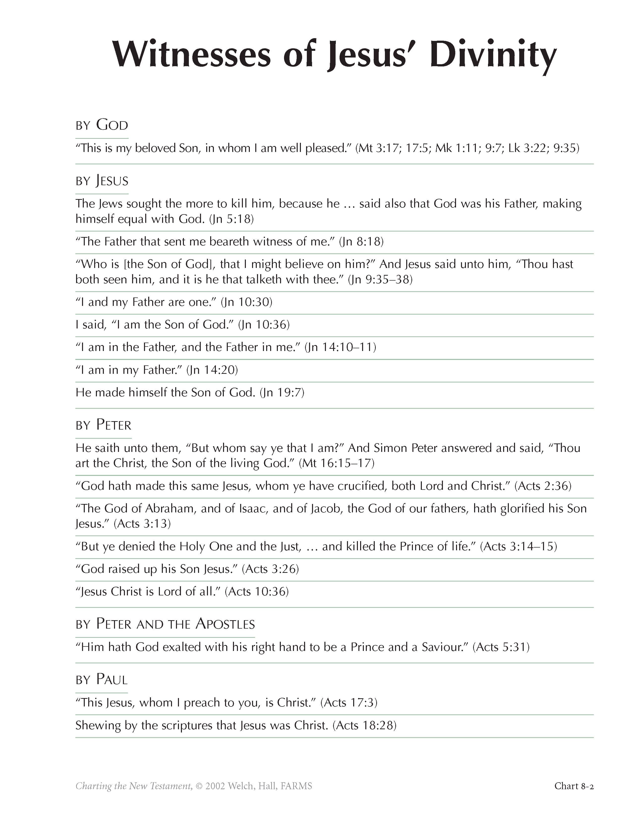 The New Testament contains numerous witnesses of the divine status or divine mission of Jesus Christ. In addition to the many miraculous deeds and fulfillment of prophecies that demonstrate that Jesus is the Christ and Son of God, these sacred records contain many direct verbal declarations of this crucial truth. This chart lists the main instances of open acknowledgment that Jesus is the Holy One, the Lord, the Son of the living God, the Messiah and Savior. These testimonies are borne by God the Father, Jesus himself, the chief apostle Peter, and the other apostles, including Paul.