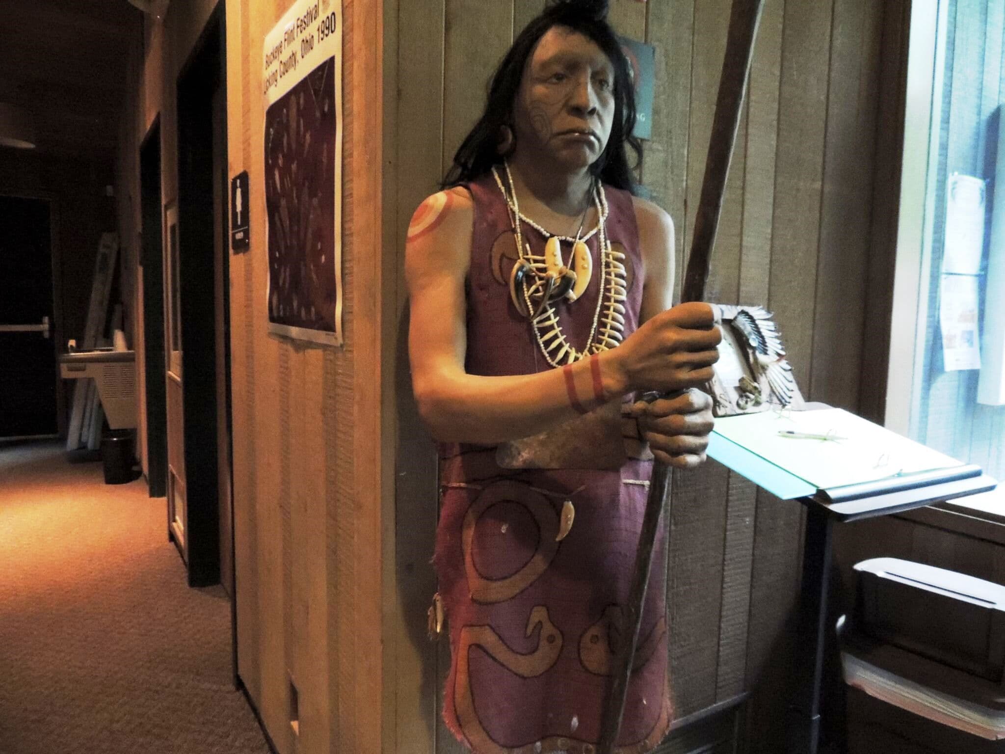 A mannequin of a member of the Hopewell culture, dressed in replica fabric apparel. This particular mannequin is from the FLint Ridge State Memorial in Licking County, Ohio.