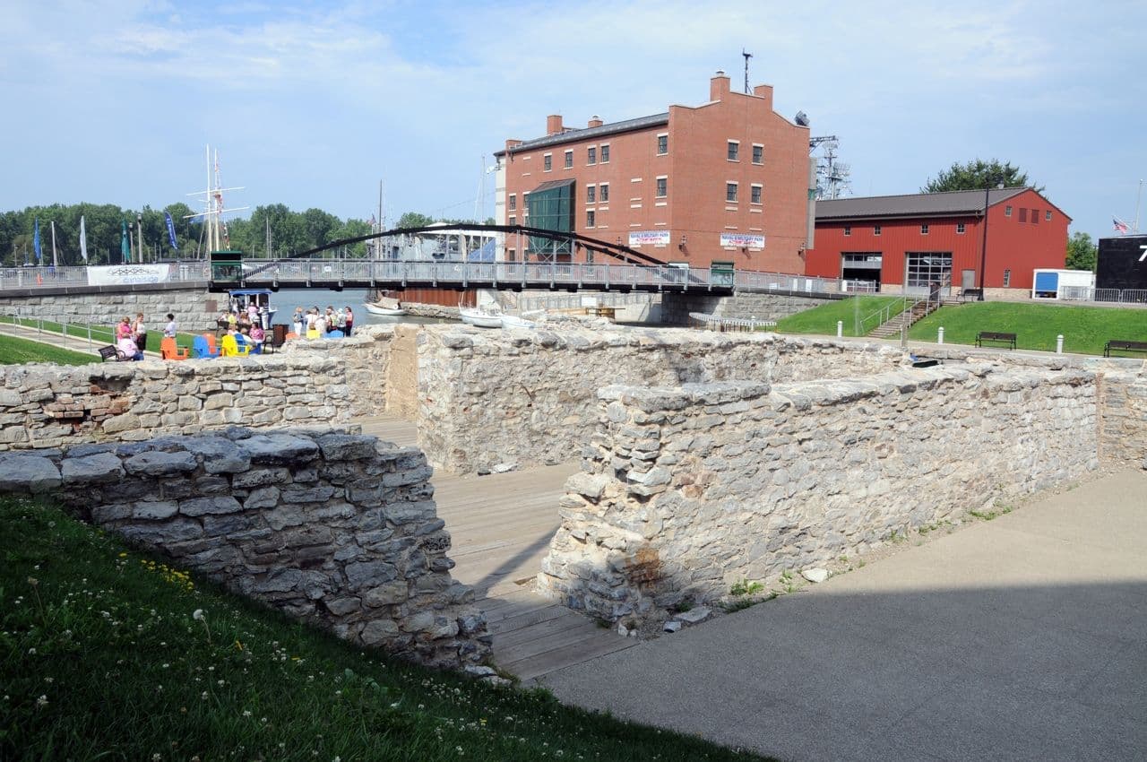 The stonework from old warehouses can be seen as well as the blue water of Lake Erie.