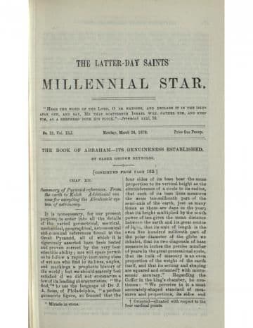 It is unnecessary, for our present purpose, to enter into all the details of the varied geometrical, metrical, mechanical, geographical, astronomical and cosmical references found in the Great Pyramid, all of which it is vigorously asserted have been tested and proven correct by the very best scientific ability; nor will space permit us to follow a rapidly-increasing class of writers who find in its lines, angles, and markings a prophetic history of the world; but we should scarcely feel satisfied if we did not summarize a few of its leading characteristics. “We find,”1 to use the language of Dr. J. A. Seiss, of Philadelphia, “a perfect geometric figure, so framed that the four sides of its base bear the same proportion to its vertical height as the circumference of a circle to its radius, that each of its base lines measures the even ten-millionth part of the semi-axis of the earth, just as many times as there are days in the year; that its height multiplied by the ninth power of ten gives the mean distance between the earth and its great centre of light, that its unit of length is the even five hundred millionth part of the polar diameter of the globe we inhabit, that its two diagonals of base measure in inches the precise number of years in the great precessional cycle, that its bulk of masonry is an even proportion of the weight of the earth itself, and that its setting and shaping are squared and oriented2 with microscopic accuracy.” Regarding the Coffer in the king's chamber, he continues: “We perceive in it a moat accurately-shaped standard of measures and proportions, its sides and bottom cubically identical with its internal apace, the length of its two sides to its height as a circle to its diameter, its exterior volume just twice the dimensions of its bottom, and its whole measure just the fiftieth part of the chamber in which it was put when the edifice was built,” for it could not have been gotten into the chamber after the building was finished by reason of the size and angles of the entrance passages. Now, then, let us add to these facts a statement by the same author, and we think our position regarding the veracity of the portion of the Book of Abraham we have lastly been commenting upon is amply vindicated. “Everywhere do we encounter the traditions of Abraham’s skill in the knowledge of the heavens, how he argued from his observation of the heavenly orbs, and how he occupied himself in Egypt teaching the priests of Heliopolis in the lore of the skies. Doubtless this was not the naked science of astronomy as the schools conceive of it, but as respected the theological and Messianic truths symbolized in these celestial hieroglyphics, in which, as in the more literal promises, he rejoiced to see Christ’s day, and saw it and was glad. (John viii, 56.)” which testimony of the Savior’s is in direct accord with the statement of the Book of Abraham: nor need we be surprised thereat, when revelation, ancient and modern, states that Enoch, and indeed other antediluvian patriarchs saw not only “Christ’s day,” but the world’s history, even to the winding up scene.