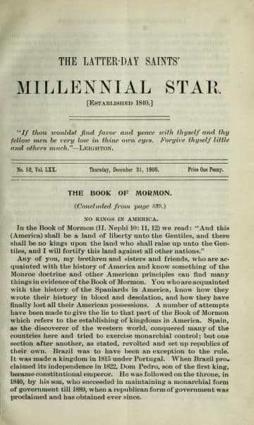 Any of you, my brethren and sisters and friends, who are acquainted with the history of America and know something of the Monroe doctrine and other American principles can find many things in evidence of the Book of Mormon. You who are acquainted with the history of the Spaniards in America, know how they wrote their history in blood and desolation, and how they have finally lost all their American possessions. A number of attempts have been made to give the lie to that part of the Book of Mormon which refers to the establishing of kingdoms in America. Spain, as the discoverer of the 'western world, conquered many of the countries here and tried to exercise monarchial control; but one section after another, as stated, revolted and set up republics of their own. Brazil was to have been an exception to the rule. It was made a kingdom in 1815 under Portugal. When Brazil proclaimed its independence in 1822, Dom Pedro, son of the first king, became constitutional emperor. He was followed on the throne, in 1840, by his son, who succeeded in maintaining a monarchial form of government till 1889, when a republican form of government was proclaimed and has obtained ever since.