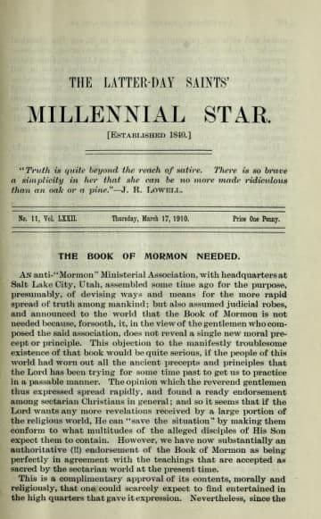 An anti-“Mormon” Ministerial Association, with headquarters at Salt Lake City, Utah, assembled some time ago for the purpose, presumably, of devising ways and means for the more rapid spread of truth among mankind; but also assumed judicial robes, and announced to the world that the Book of Mormon is not needed because, forsooth, it, in the view of the gentlemen who composed the said association, does not reveal a single new moral precept or principle. This objection to the manifestly troublesome existence of that book would be quite serious, if the people of this world had worn out all the ancient precepts and principles that the Lord has been trying for some time past to get us to practice in a passable manner. The opinion which the reverend gentlemen thus expressed spread rapidly, and found a ready endorsement among sectarian Christians in general; and so it seems that if the Lord wants any more revelations received by a large portion of the religious world, He can “save the situation” by making them conform to what multitudes of the alleged disciples of His Son expect them to contain. However, we have now substantially an authoritative (!!) endorsement of the Book of Mormon as being perfectly in agreement with the teachings that are accepted as sacred by the sectarian world at the present time.