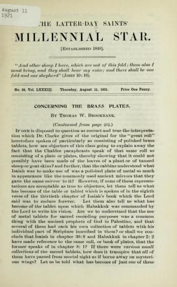 In response to the objection that Israelites could not have engraved a record on brass plates, Brookbank shows examples in the Old Testament that indicate that they did in fact use brass in creating records (Isaiah 8:1-2 and Habakkuk 2:2). Brookbank argues that the brass plates used by Isaiah and Habakkuk are what became the brass plates that Lehi took to the Americas. The fifth part concludes the series.