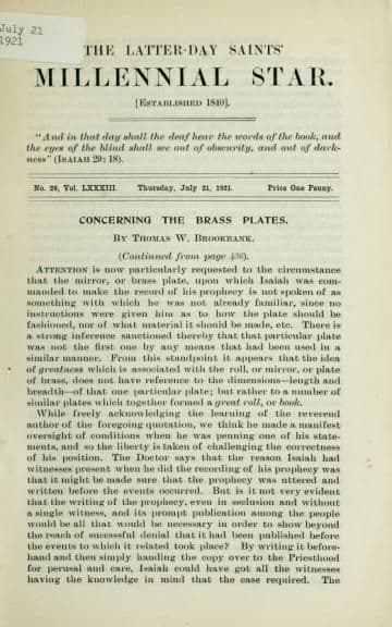 In response to the objection that Israelites could not have engraved a record on brass plates, Brookbank shows examples in the Old Testament that indicate that they did in fact use brass in creating records (Isaiah 8:1-2 and Habakkuk 2:2). Brookbank argues that the brass plates used by Isaiah and Habakkuk are what became the brass plates that Lehi took to the Americas. The second part discusses the physical characteristics of the plates.