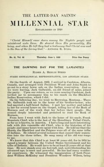 This article recounts efforts by Latter-day Saints to proselytize to Native Americans. It includes a time when Native American students visited the Alberta, Canada Temple. They saw wall paintings that depicted Lehi offering a sacrifice after landing on American soil, and a picture of Christ administering the sacrament to a Lamanite at his coming after his resurrection.