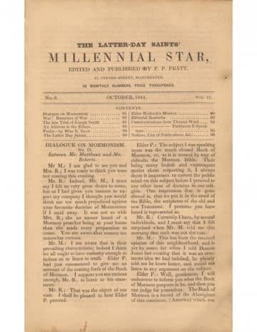 Mr. R.: Indeed, Mr. M., I must say I felt no very great desire to come, but as I had given you reasons to expect my company I thought you would think me too much prejudiced against your favourite doctrine of Mormonism if I staid away. It was not so with Mrs. R.; she no sooner heard of a Mormon preacher being at your house than she made every preparation to come. You are aware that women are somewhat curious.