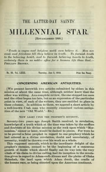 In this issue of the Millennial Star, we give place to some comments by two of our young missionaries, who each perceived this association, one of them reaching the conclusion that the Mayas or their ancestors furnished the original ideas adopted by the Egyptians, and the other that the language and arts and civilization of the Mayas were derived from Egyptian sources. Neither of them, however, makes any dogmatic assertions, or reaches a positive conclusion. Both are believers in the remarkable record called The Book of Mormon, and consequently in the divine mission of the prophet Joseph Smith.