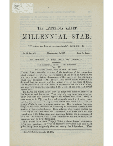 In a recent letter from Tonga,1 Elder Andrew Jenson enumerates seven very remarkable survivals of Hebrew observances that have until quite lately been religiously observed among the Polynesians. What Brother Jenson states of these islanders is equally true of the Lamanites of this continent, they retained like observances until long after the coming of the Spaniards and those that followed them; indeed, some are observed in remote tribes to the present day. Nor are those enumerated by Elder Jenson all that bear record of the Lamanites’ Israelitish descent; we shall refer to others before we close this chapter.