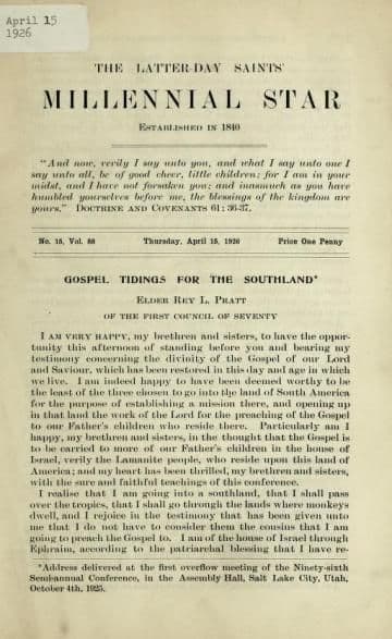 Pratt, who has been called to conduct missionary work in “the southland,” quotes 2 Nephi 1:1-11, 1 Nephi 13, 2 Nephi 30, and 3 Nephi 21 that speak of the fall, final gathering, and redemption of the Lamanites.