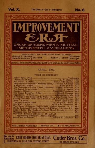 In the May number of the IMPROVEMENT ERA, 1906, the editors promised their readers an article by me, in the then near future, on the Immortality of the Soul, as taught in the Book of Mormon; and having special reference to some questions that had been asked respecting the doctrine as set forth in the Young Men's Manual of that year. The neglect on my part to enable the editors to fulfil their promise to their readers surely calls for explanation, and perhaps apology. The fulfilling of the promise given to the editors to write such an article seemed perfectly easy when it was given; but about the time it should have been fulfilled one call and duty after another so pressed me-one trod upon another's heels, so fast they followed-that it was impossible to write the article. Then, towards the close of the volume within which at least I determined to publish the article, I was called to visit the Eastern and Southern States Missions in company with Elder George Albert Smith, of the council of the Twelve Apostles, which again postponed the writing of the article until now; and even now it is undertaken in the midst of many other duties that urgently demand attention and frequently interrupt the work. Such is my apology to the editors and readers of the ERA for the delay of this article; and which I trust will be accepted as an evidence, at least, that I have not been willfully neglectful of my promise.