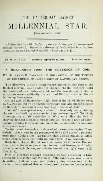 On the 21st of September, 1823, Joseph Smith, of Manchester, N.Y., was visited by an angelic personage who announced himself as Moroni, “a messenger sent from the presence of God.”