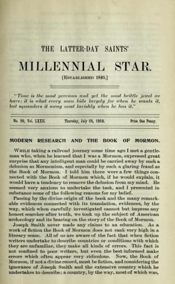 The Book of Mormon was published in the spring of 1829. At that time very little was known of the arclueology of the country. None of the books on the subject which we now have were then written. Half of the American continent was an unexplored wilderness. Brief accounts of the ruins of Peru and Mexico had reached the world through Humboldt and others, but no systematic study of them had been made and no one knew whether the style of their architecture resembled that of Egypt, Greece or Hindustan. In those days it was the prevailing opinion that America had never been peopled by any other race than the red man. That the American races had never known domestic animals such as the elephant, horse, ox, sheep and swine. That they were unfamiliar with iron and steel. That outside of Mexico they had never known a written language.