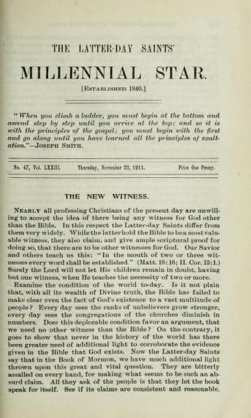 Nearly all professing Christians of the present day are unwilling to accept the idea of there being any witness for God other than the Bible. In this respect the Latter-day Saints differ from them very widely. While the latter hold the Bible to be a most valuable witness, they also claim, and give ample scriptural proof for doing so, that there are to be other witnesses for God. Our Savior and others teach us this: “In the mouth of two or three witnesses every word shall be established.” (Matt. 18:16; II. Cor. 13:1.) Surely the Lord will not let His children remain in doubt, having but one witness, when He teaches the necessity of two or more.