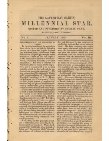 This article is a letter written to W. W. Phelps from Norton, Medina County, Ohio, Sabbath evening, September 7, 1834. Cowdery writes of his first meeting with the prophet and his immediate work began as scribe for Joseph Smith for the translation of the Book of Mormon. Then he writes of the manifestation of the angel to give the Aaronic Priesthood.