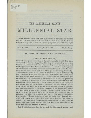 What will be the standing, in the day of judgment, of a man who should be asked, did he obey the Gospel as taught by the Savior, and his answer should be that he did not know it was on the earth during his lifetime? Did he read the Book of Mormon? He read part of it, or perhaps all of it, but could not accept it because of two or three little grammatical errors which it contained. Did they take away any of its clearness, or obsure its meaning? No, but he thought the record of God should be free from all these. Was he not told in the beginning of the book that all such faults were due to the mistakes of men? Was not the warning given that he should not reject the things of God for any such flimsy reason? The testimony of the witnesses of the Book of Mormon is that the translation was made by the gift and power of God, which testimony he had read. Will not such a person be left without excuse, and counted among the unbelievers? B.