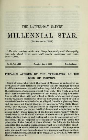 Some of those who reject the Book of Mormon as an inspired record, justify their action on the ground that its language does not in all instances comport with what they think should characterize the utterances of a messenger sent from God. It is freely admitted that there are errors of grammar in that work; but they are harmless to affect the truth, and afford no little evidence that Joseph Smith was more anxious to offer the unvarnished word of God to mankind than he was to clothe an alleged fraud in a pleasing dress, and we must not forget that, as Dr. Angus, in “The Bible Handbook,” par. 38, says, “the perfection of inspired composition is not so much classic purity as intelligibleness and adaptation to its proper end.” These remarks of the learned author apply with unusual force to the Book of Mormon, wherein textual plainness is a distinguishing feature, and its lingual errors in no respect mystify the sense. In all respects it is eminently adapted to teach the principles of the Gospel of Jesus Christ. So fully do its friends recognize this valuable characteristic that it is distributed broadcast in all the world without doctrinal comment. Its acceptance with the people thus depends upon its own plain teachings, in their most obvious sense, and not upon what Dr. A. or Dr. B. reads into the text or out of it.