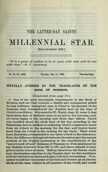 One of the most remarkable consistencies in the Book of Mormon, and one that conceals a deadly and unsuspected pitfall for any ordinary, uninspired man, is found in the account of the darkness that overshadowed the Nephite land at the time of Christ’s crucifixion. It is stated in III. Nephi, chap. 10, verse 9, that these three days of darkness came to an end in the morning; and, of course, began in the morning just three days before. Christ was crucified about the ninth hour of the day, according to the Palestinian Jewish method of reckoning twelve consecutive hours from six o’clock in the morning for the day; and twelve hours more from six o’clock in the evening for the night. Their ninth hour, therefore, corresponded to our three o’clock in the afternoon. Now, the difference in longitude between Jerusalem and the central portions of the Nephite possessions in the neighborhood of the “narrow neck of land” (Isthmus of Panama) so often mentioned by the Nephite writers is from 105° to 110°, and these reduced to time give us seven hours or more. Taking these from the Jewish ninth hour the simultaneous time in the Nephite land for the crucifixion of Jesus was between seven and eight o’clock in the morning. Now, nature would feel the murder of her God and Creator, as an electric shock at the same instant in all quarters of the world, and would at the same instant in every quarter manifest its resentment at His cruel death. The Book of Mormon writers, by not waiting for the earth to revolve in its course through 105 or 110 degrees of longitude before the American half of this world could begin to display its' wrath, are grandly consistent. When our attention is called to this point, how easy it is for ns to see that the Book of Mormon is right in claiming, practically, that the time when Christ died was at a morning hour in the Nephite land. We can see, also, how easy it would have been for an “unlearned” impostor to fall into the deadly error of copying the Biblical account of the Savior’s death—Jerusalem time with all else.