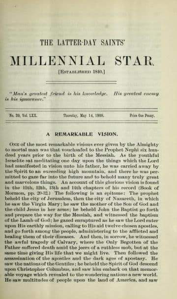 One of the most remarkable visions ever given by the Almighty to mortal man was that vouchsafed to the Prophet Nephi six hundred years prior to the birth of the Messiah. As the youthful Israelite sat meditating one day upon the things which the Lord had manifested in vision unto his father, he was carried away by the Spirit to an exceeding high mountain, and there he was permitted to gaze far into the future and to behold many truly great and marvelous things. An account of this glorious vision is found in the 11th, 12th, 13th and 14th chapters of his record (Book of Mormon, pp. 20-32.) The following is an epitome: The prophet beheld the city of Jerusalem, then the city of Nazareth, in which he saw the Virgin Mary; he saw the mother of the Son of God and the child Jesus in her arms; he beheld John the Baptist go forth and prepare the way for the Messiah, and witnessed the baptism of the Lamb of God; he gazed enraptured as he saw the Lord enter upon His earthly mission, calling to His aid twelve chosen apostles, and go forth among the people, administering to the afflicted and healing them of their diseases. And then, in sorrow, he witnessed the awful tragedy of Calvary, where the Only Begotten of the Father suffered death amid the jeers of a ruthless mob, but at the same time giving His life that we might live. Then followed the assassination of the apostles and the dark ages of apostasy. He saw the nations of the Gentiles; he beheld the Spirit of God descend upon Christopher Columbus, and saw him embark on that memorable voyage which revealed to the wondering nations a new world. He saw multitudes of people upon the land of America, and saw the remnant of his seed and the seed of his brethren (the American Indians) driven before them and scattered. And finally he saw the dawning of a brighter era, the restoration of the everlasting gospel, in all its fulness and pristine power and authority, and men sent forth to proclaim it, first to the Gentiles and afterward to the Jews. Not one jot or tittle of this remarkable vision has been left unfulfilled, but every event foreshadowed by the prophet has literally come to pass.